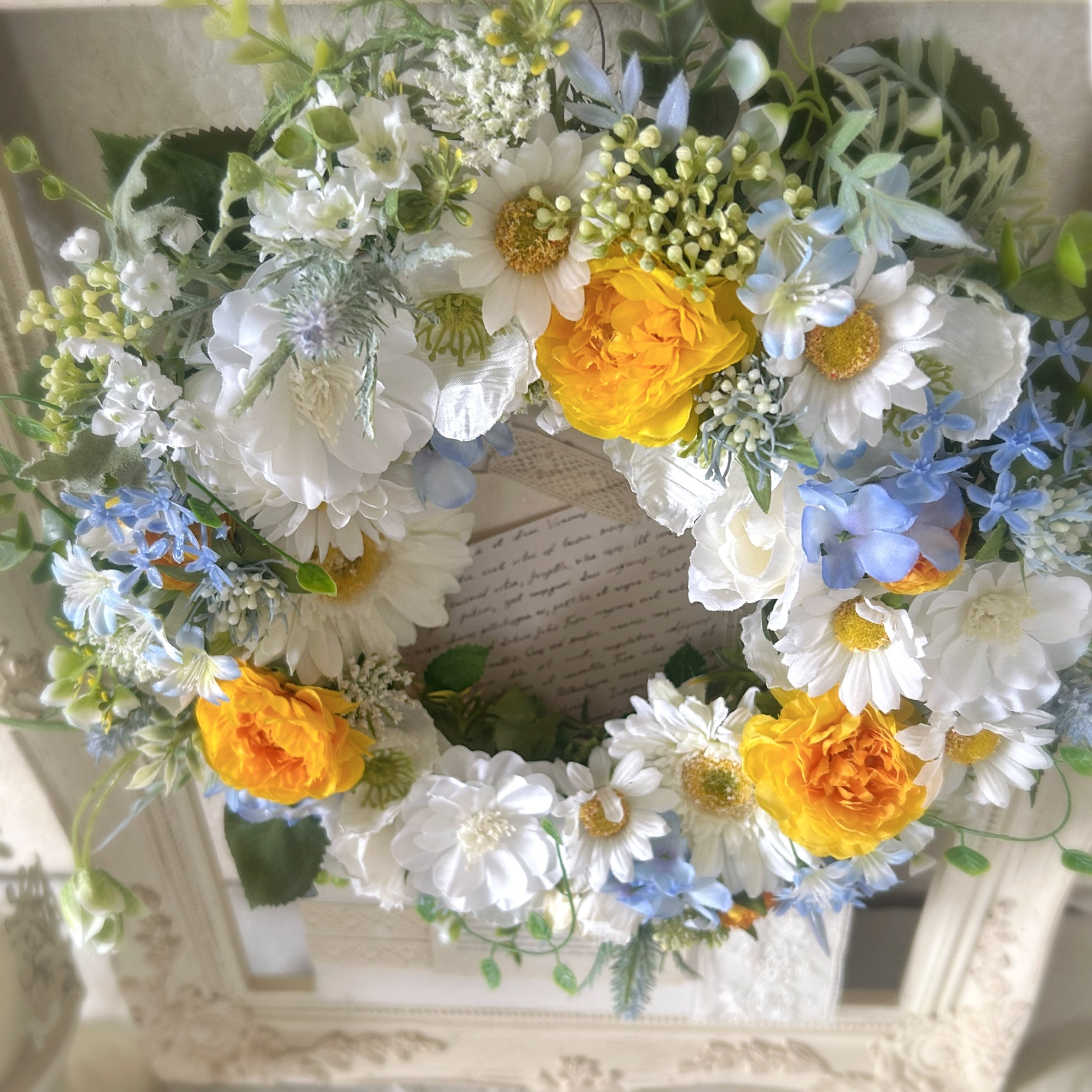 白いガーベラ・バラ・デイジーのナチュラルリース サマーリース 玄関飾り ドアリース フラワーインテリア フラワーギフト 新築祝い 結婚祝い 誕生日プレゼント
