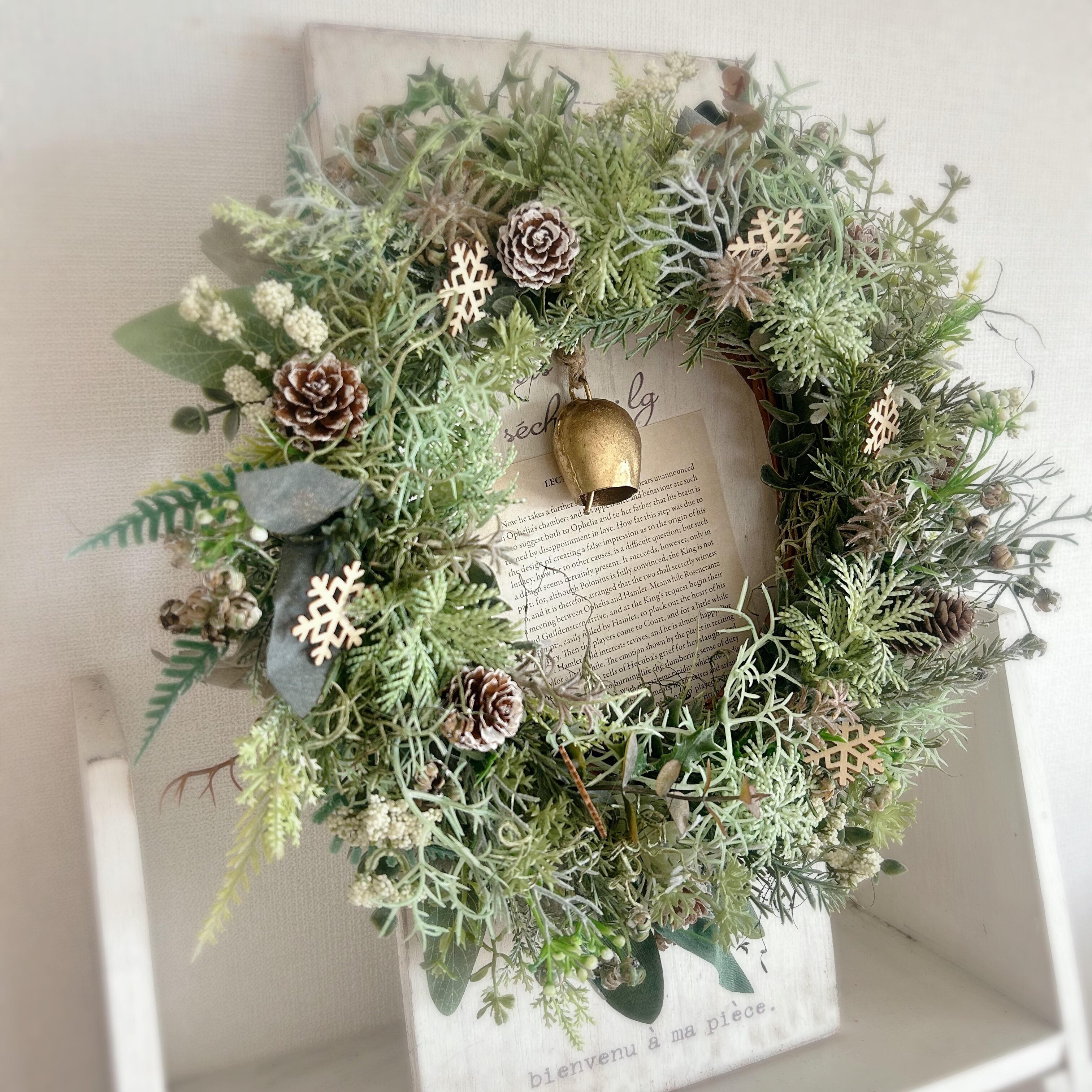 手作りの温かさが感じられる、ベル付きのグリーンクリスマスリースです。直径30cmのサイズで、ナチュラルなグリーンが特徴。シンプルでありながら、飾るだけでお部屋を素敵に変えてくれます。