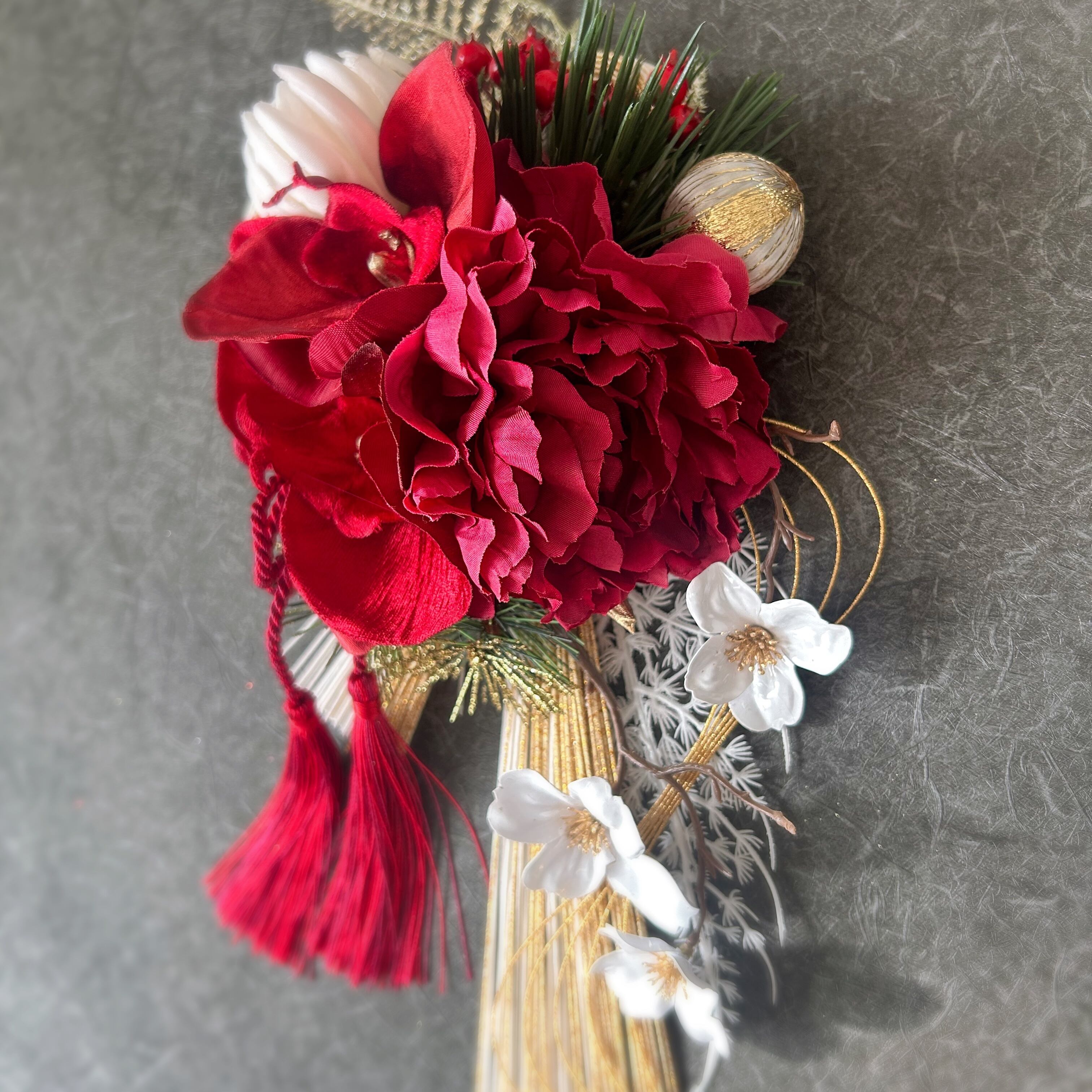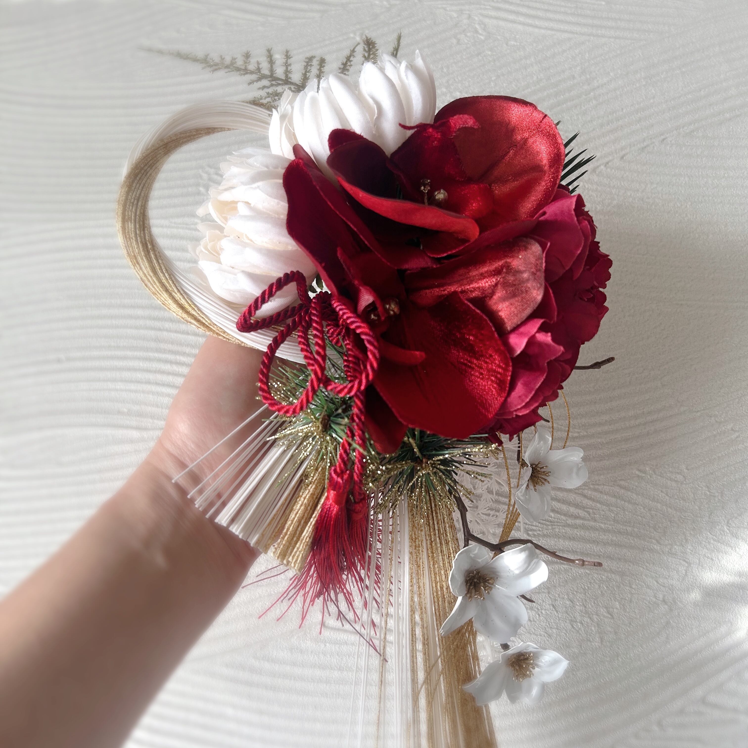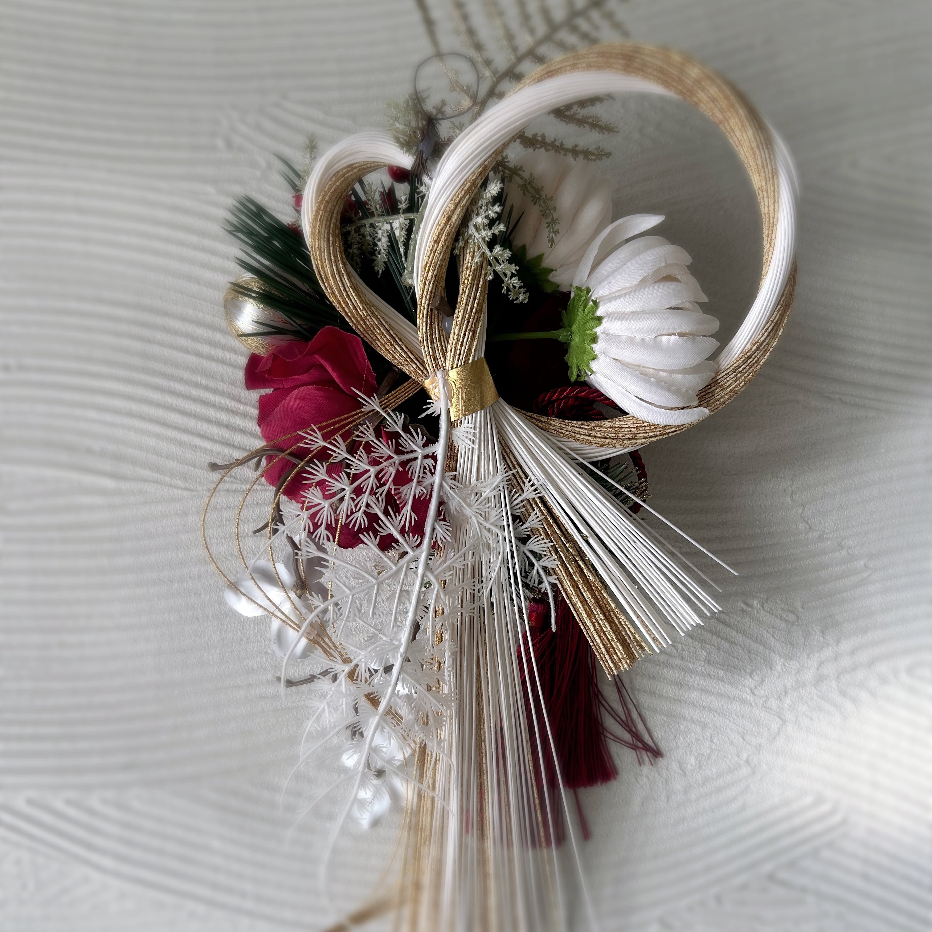 《使用花材》アーティフィシャルフラワー:胡蝶蘭、菊、ヒカゲノカズラ、ハナミズキ、松、その他:しめ縄、水引