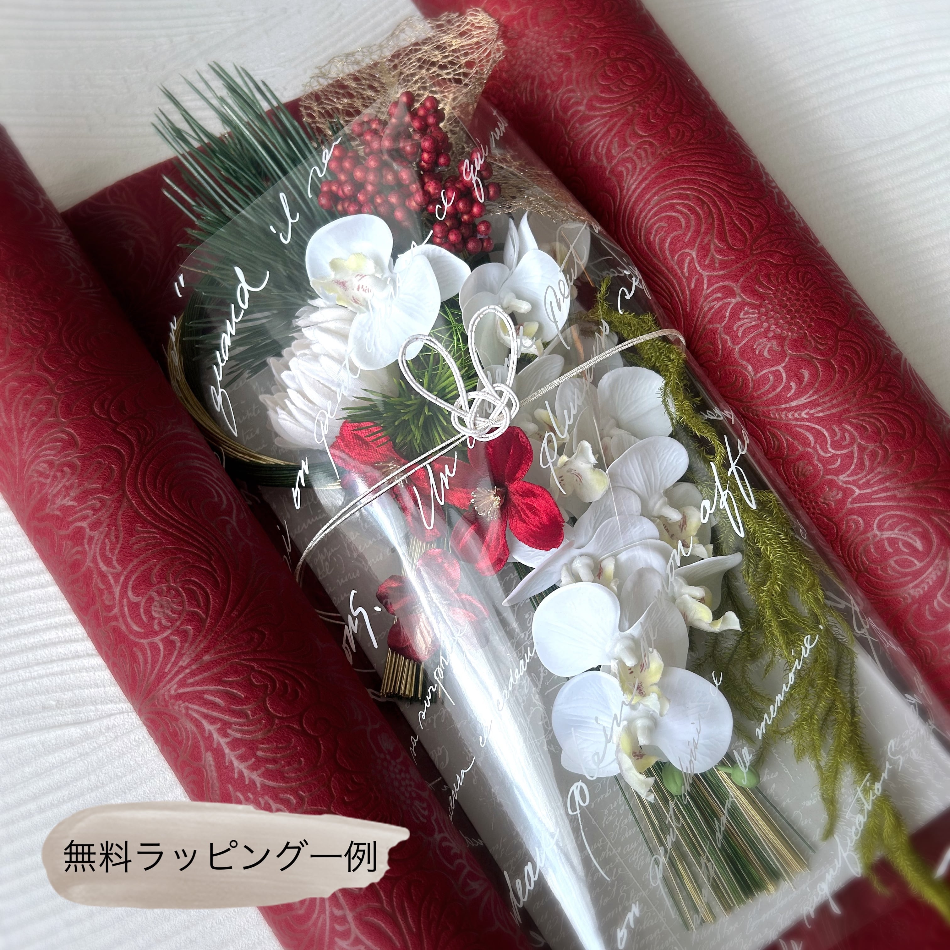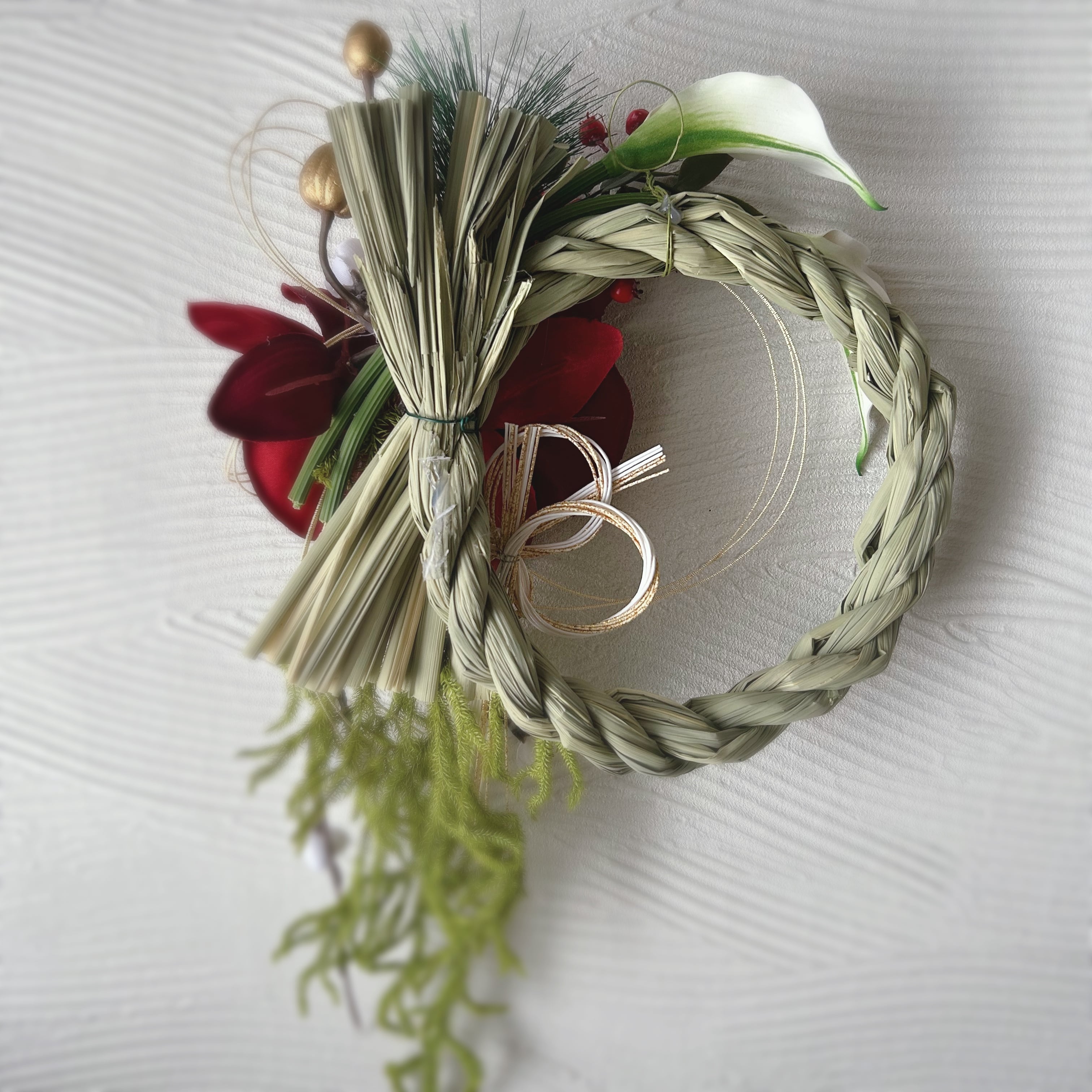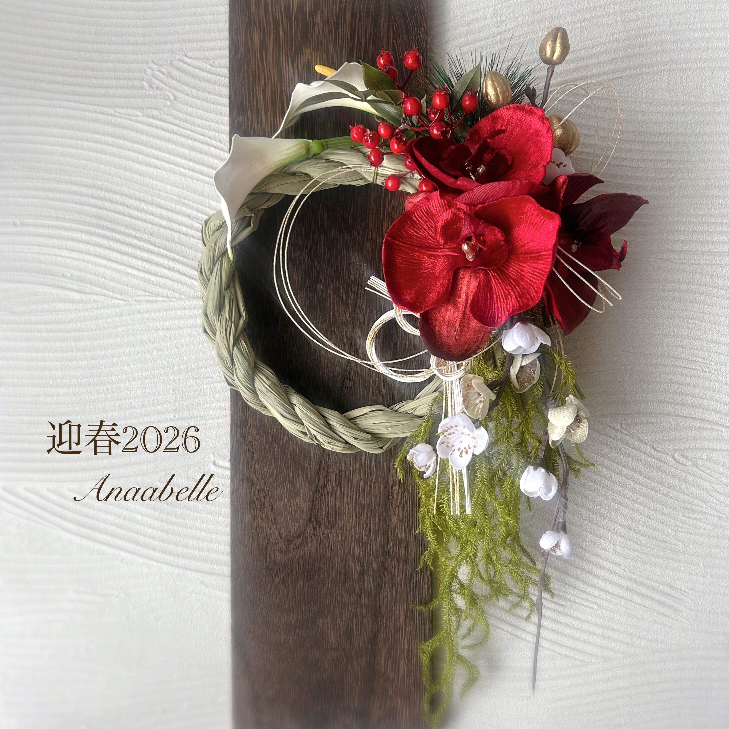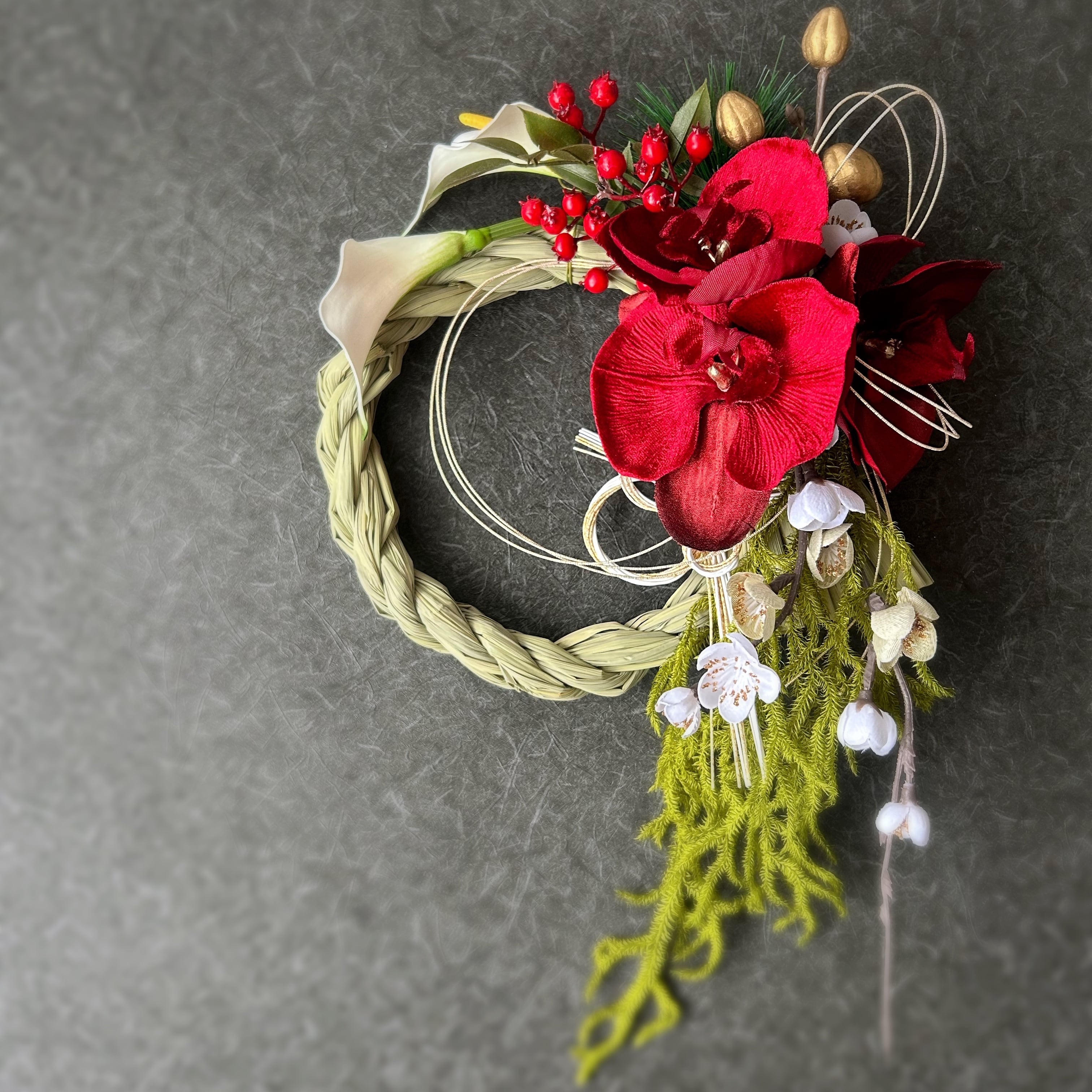 《使用花材》アーティフィシャルフラワー:胡蝶蘭、カラー、梅、ヒカゲノカズラ、松、その他:しめ縄、水引
