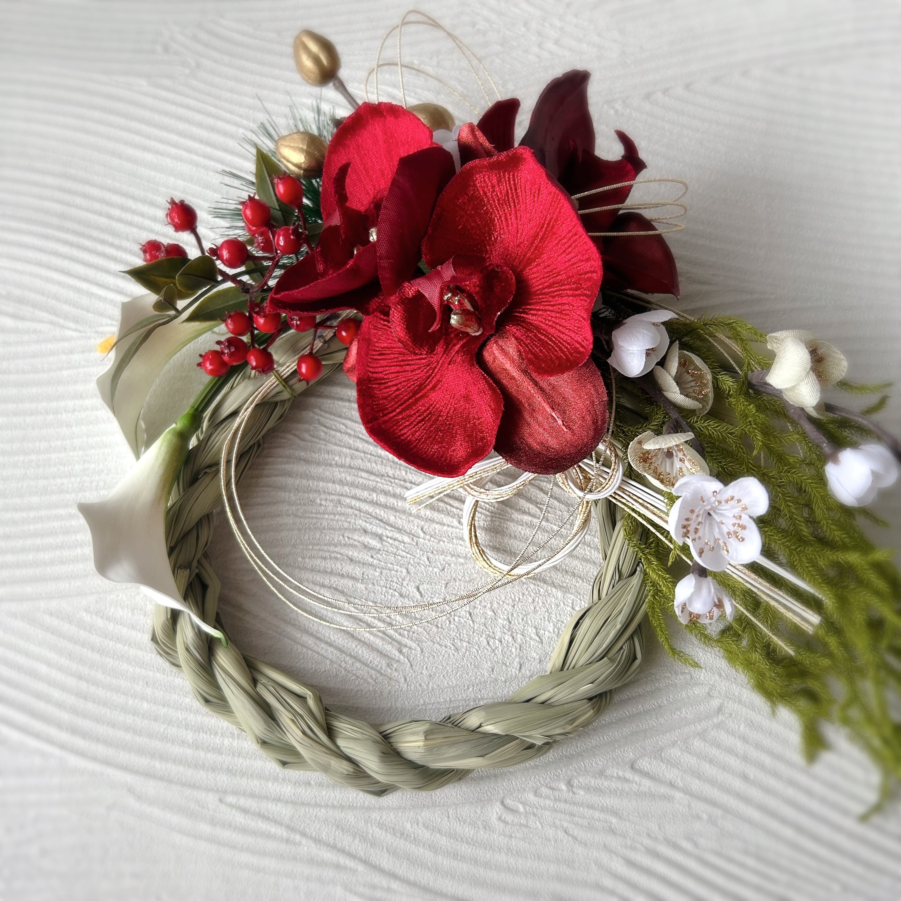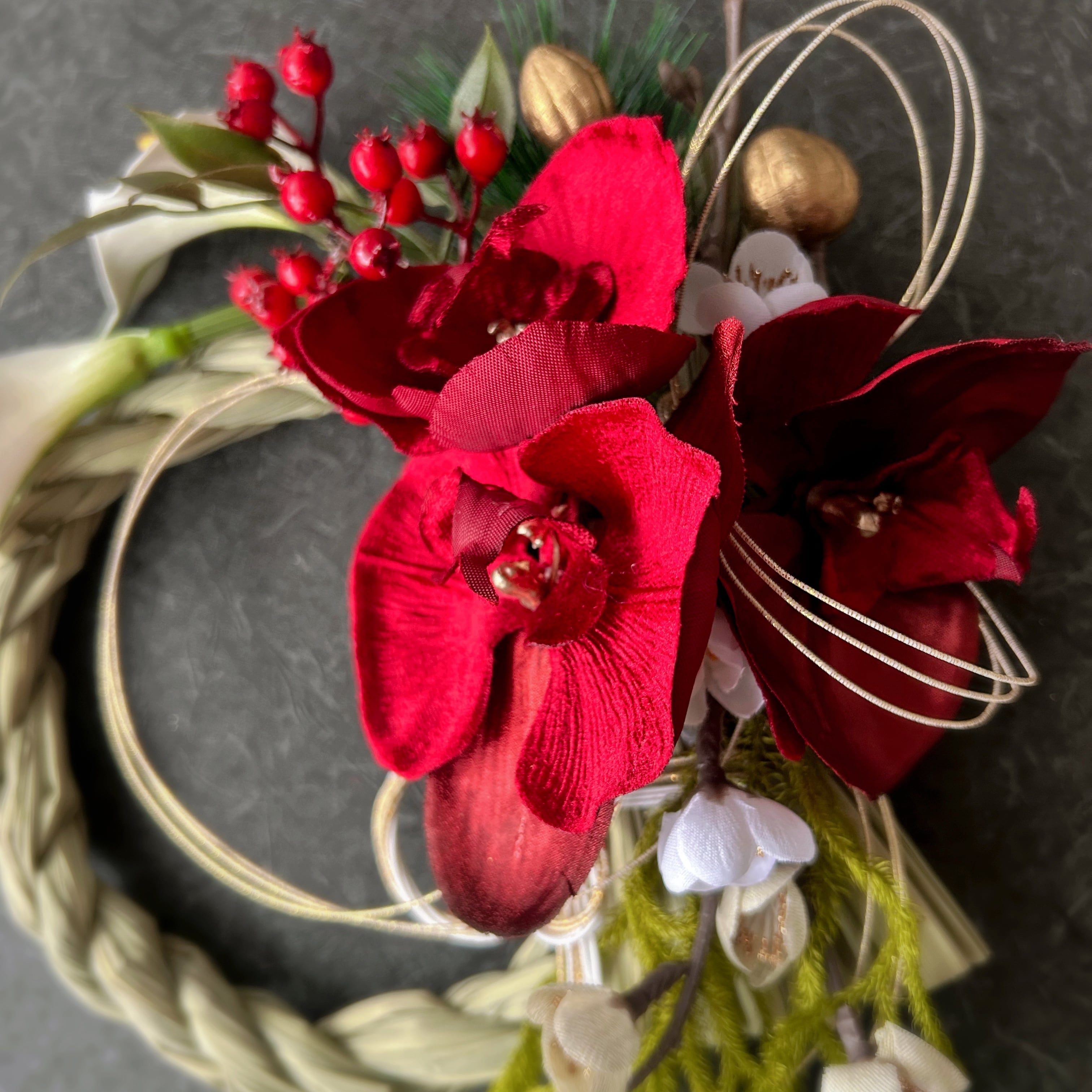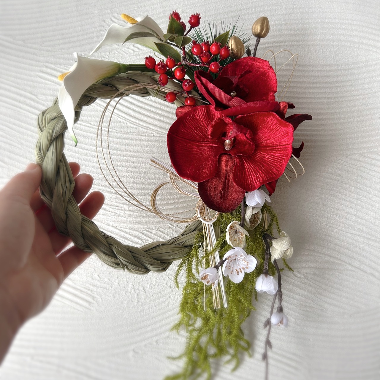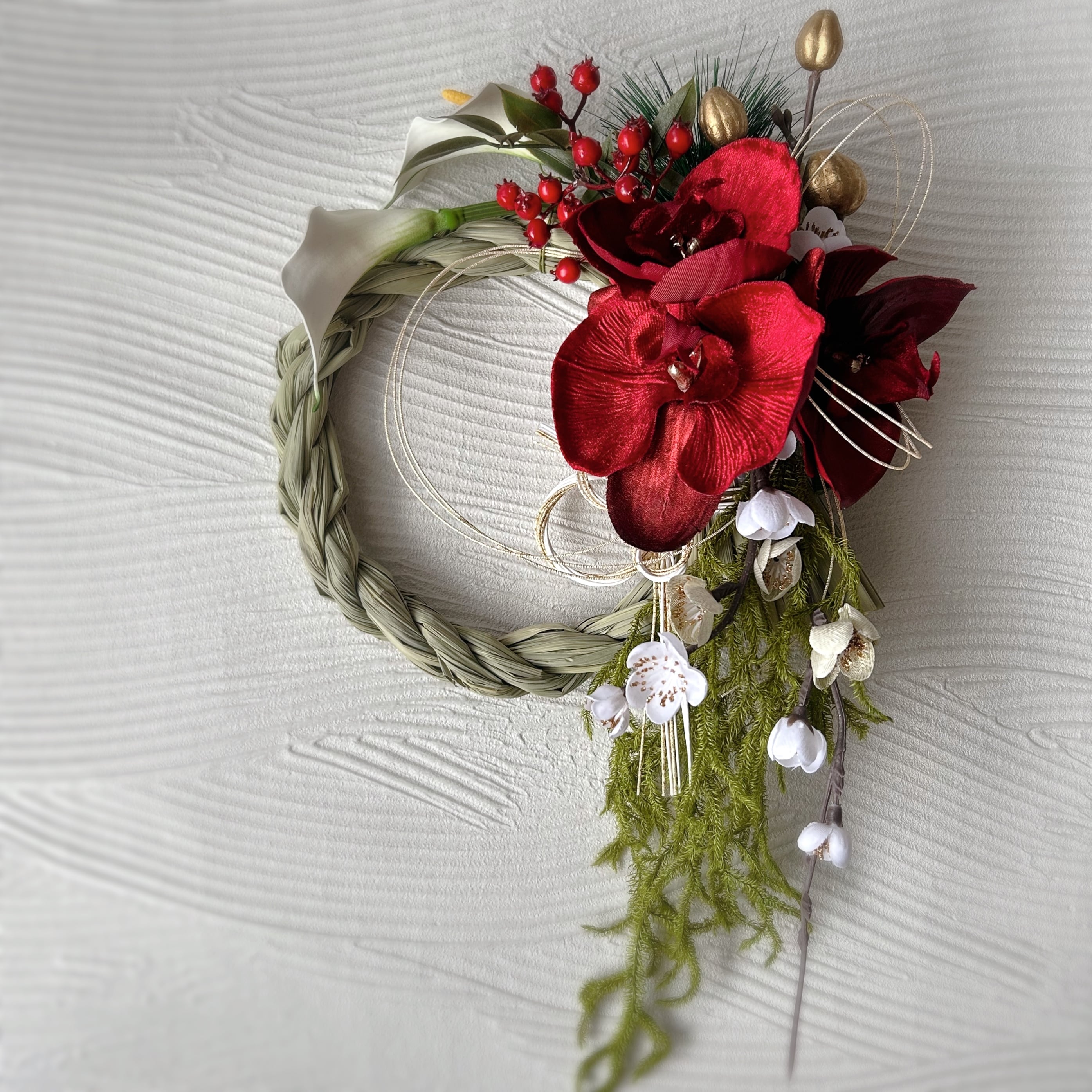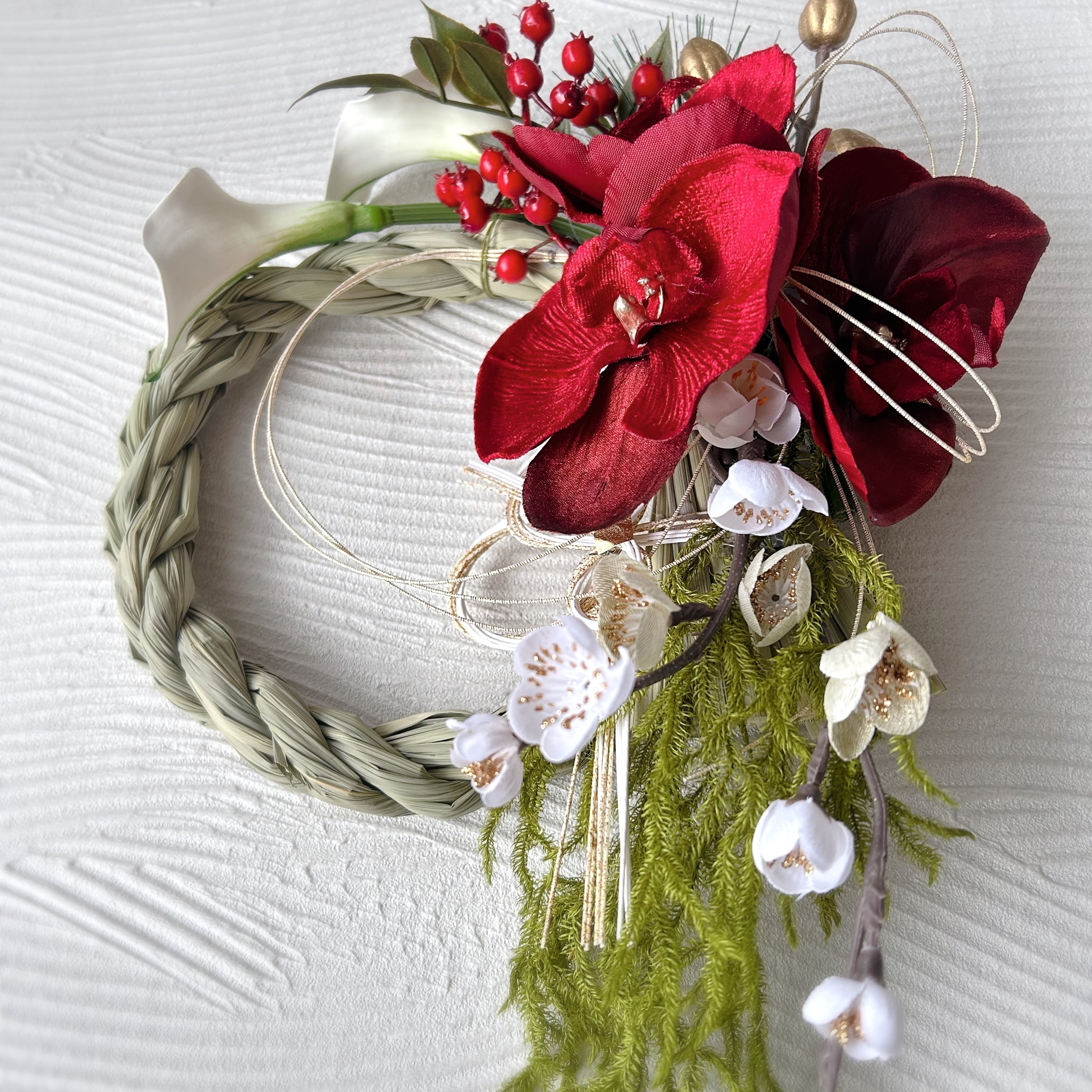 赤い胡蝶蘭と白いカラー・梅の紅白しめ飾り お正月飾り 迎春飾り おしゃれしめ縄 和モダン 上品 華やか 豪華 お飾り 胡蝶蘭 玄関 壁掛け