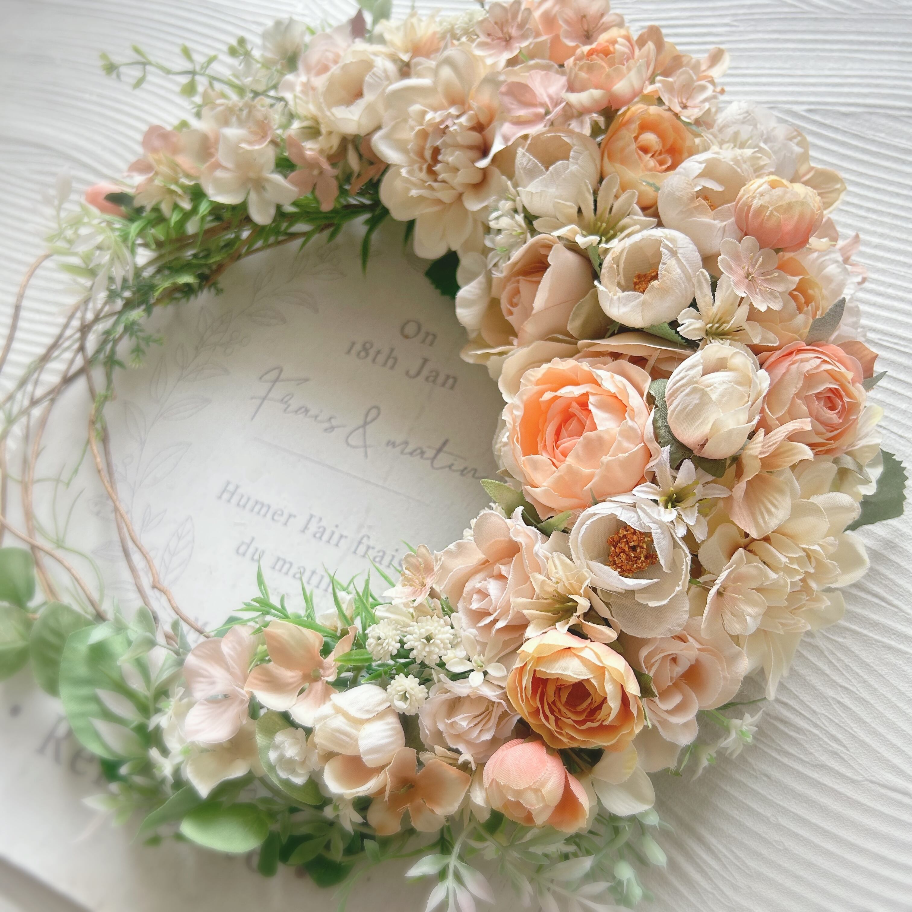 サーモンピンクのローズクレセントリース/フラワーギフト/ナチュラルリース/アーティフィシャルフラワー/リース/三日月リース/クレセントリース/ピンクリース/ウェディング/ウェディングアイテム/結婚式/結婚祝い/新築祝い/ドアリース/ウェルカムフラワー