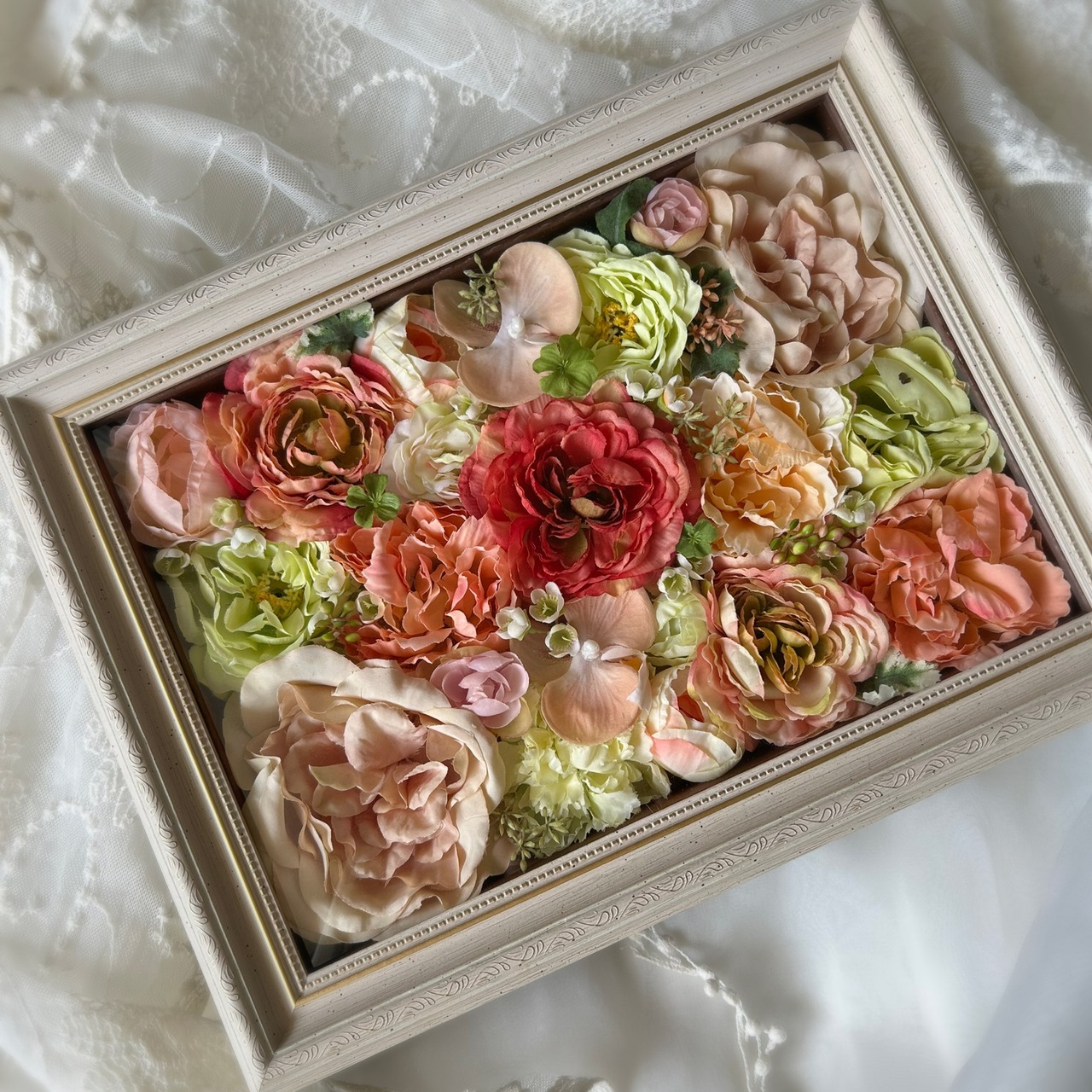 グリーン、ピンク、オレンジ、ベージュ系のお花たちををアンティーク調のボックスフレームに