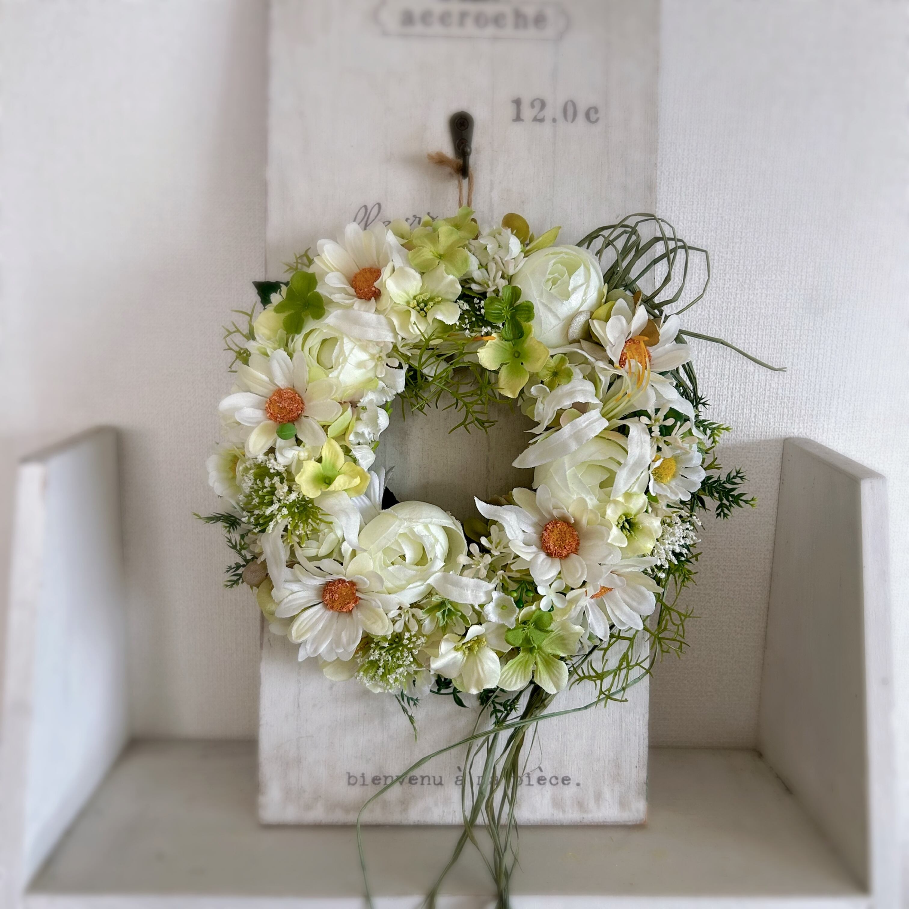 白いラナンキュラスをメインにバラ、ライラック、紫陽花、マーガレット、デンファレ、ネリネ、すずらんなどを散りばめた優しいホワイトグリーンのミニリースです。