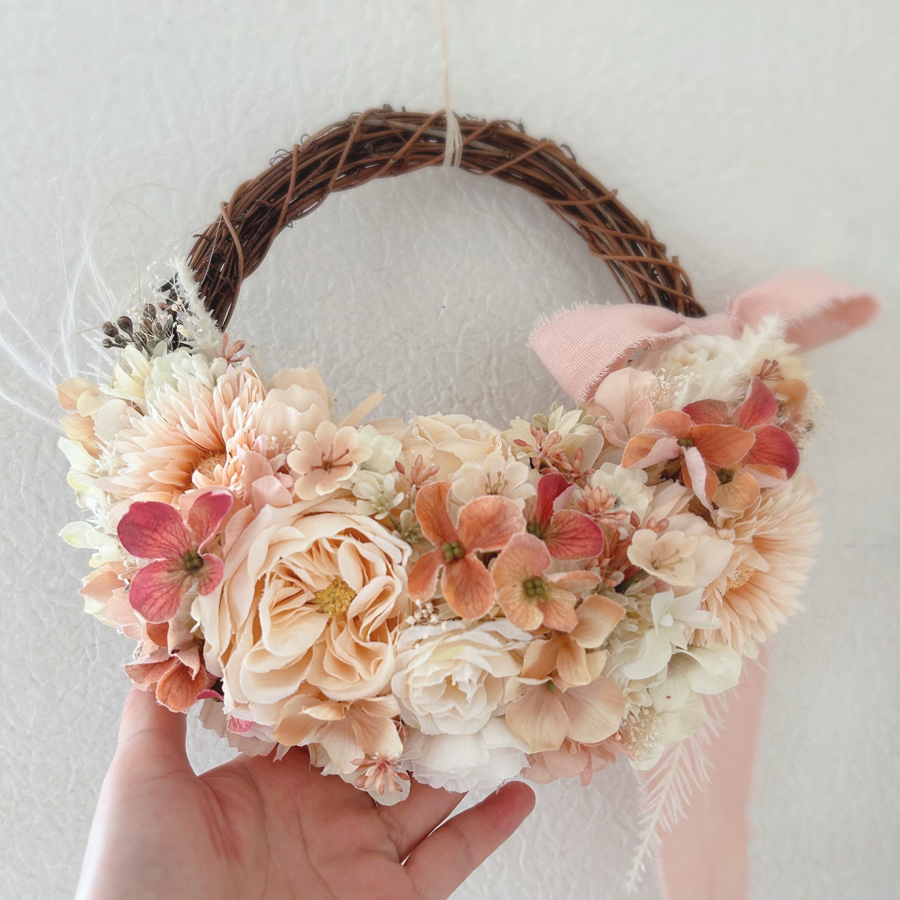 オレンジピンクのハーフリース/フラワーギフト/ナチュラルリース/アーティフィシャルフラワー/ハーフリース/リース/くすみカラー/シャビーシック/ドアリース/結婚祝い/新築祝い/開店祝い/ウェディングアイテム/誕生日ギフト/母の日ギフト