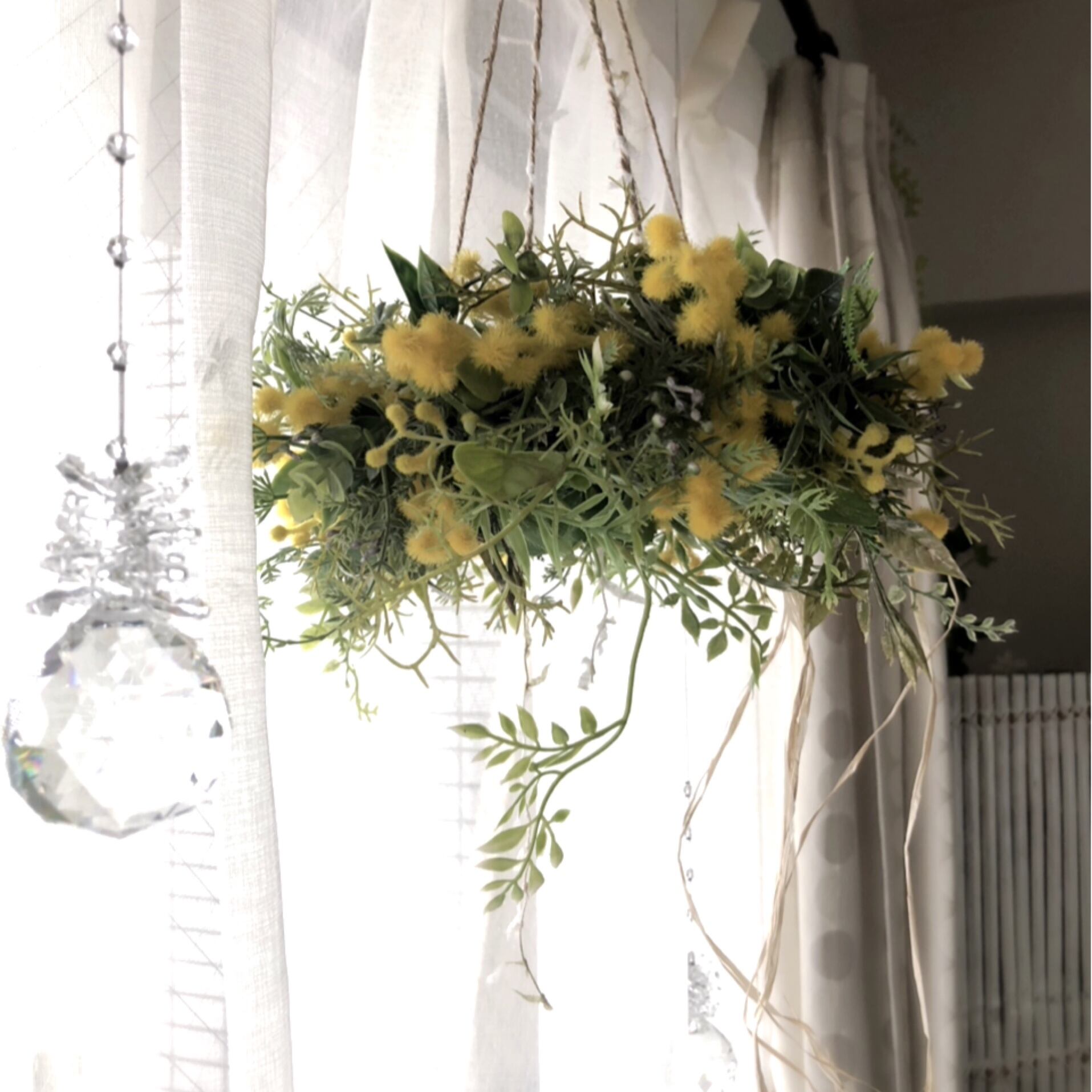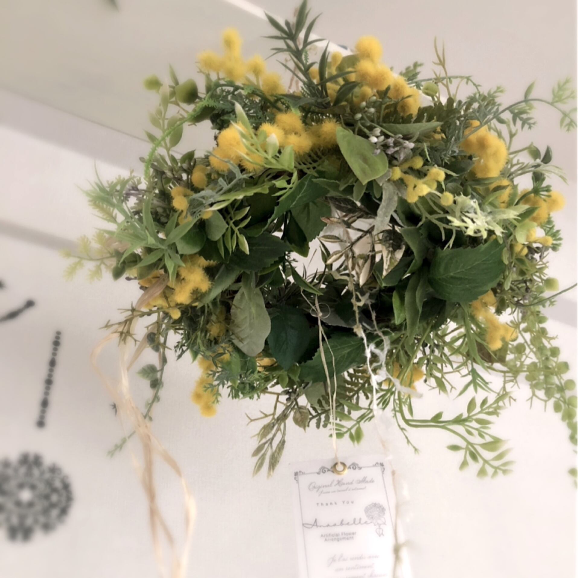 ミモザとグリーンのフライングリース/フラワーギフト/アーティフィシャルフラワーリース/フライングリース/ミモザリース/ミモザ/アーティフィシャルフラワーリース/春リース/新築祝い/結婚祝い/開店祝い/誕生日ギフト/グリーンインテリア/ハンギングリース