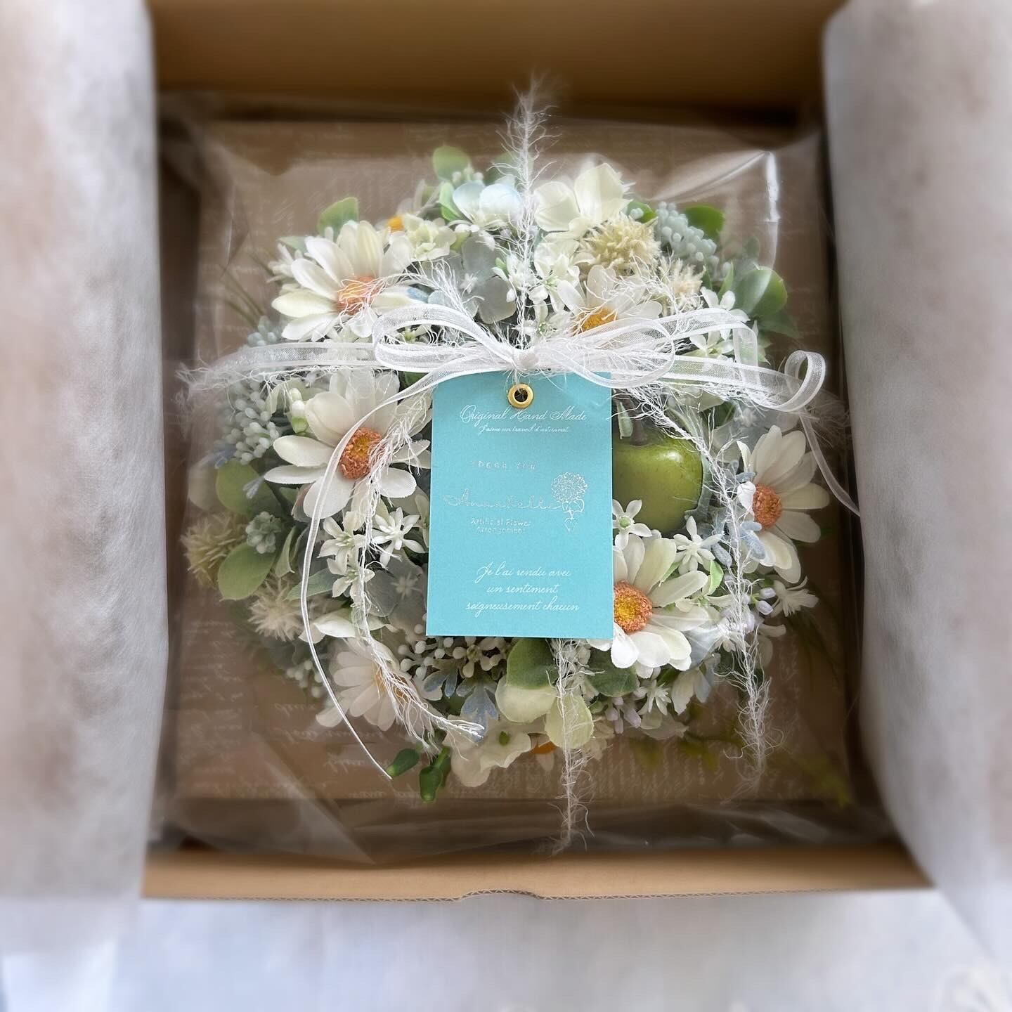 《使用花材》アーティフィシャルフラワー:ユーカリ、ローズマリー、セージ、グリーンネックレス、ベビーブレス、ワイルドグラス、カモミール、ティーリーフ、グリーン類、ラフィア麻