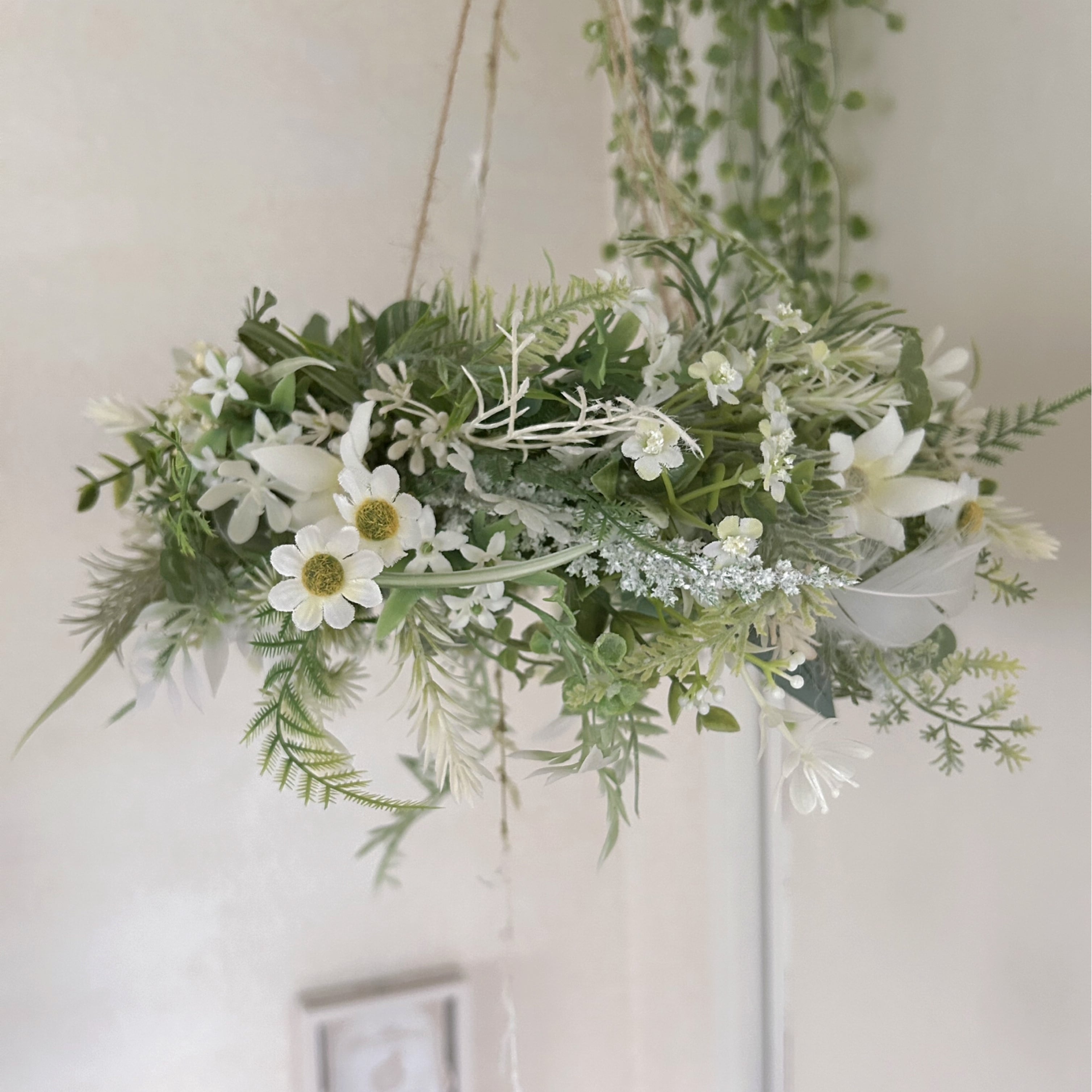 グリーンと白い小花の羽根付きフライングリース/フラワーギフト/フラワーインテリア/窓辺インテリア/ハンギングリース/ナチュラルリース/フライングリース/グリーンインテリア/グリーンリース/吊るすリース/ハンギングリース/新築祝い/結婚祝い/開店祝い