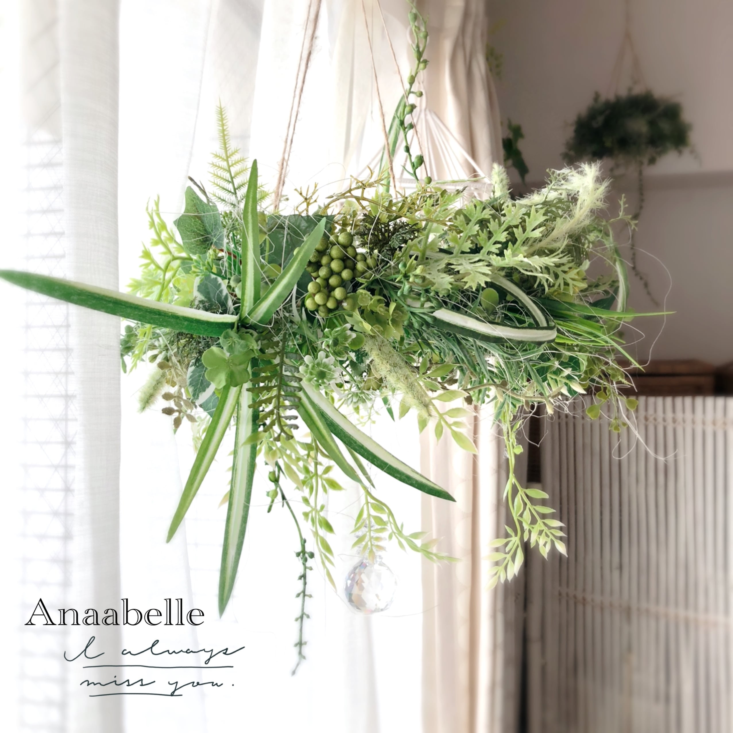 《使用花材》アーティフィシャルフラワー:オリヅルラン、ローズマリー、ユーカリ、スパニッシュモス、ダスティミラー、ティーリーフ、グリーンネックレス、シダ、グリーン類