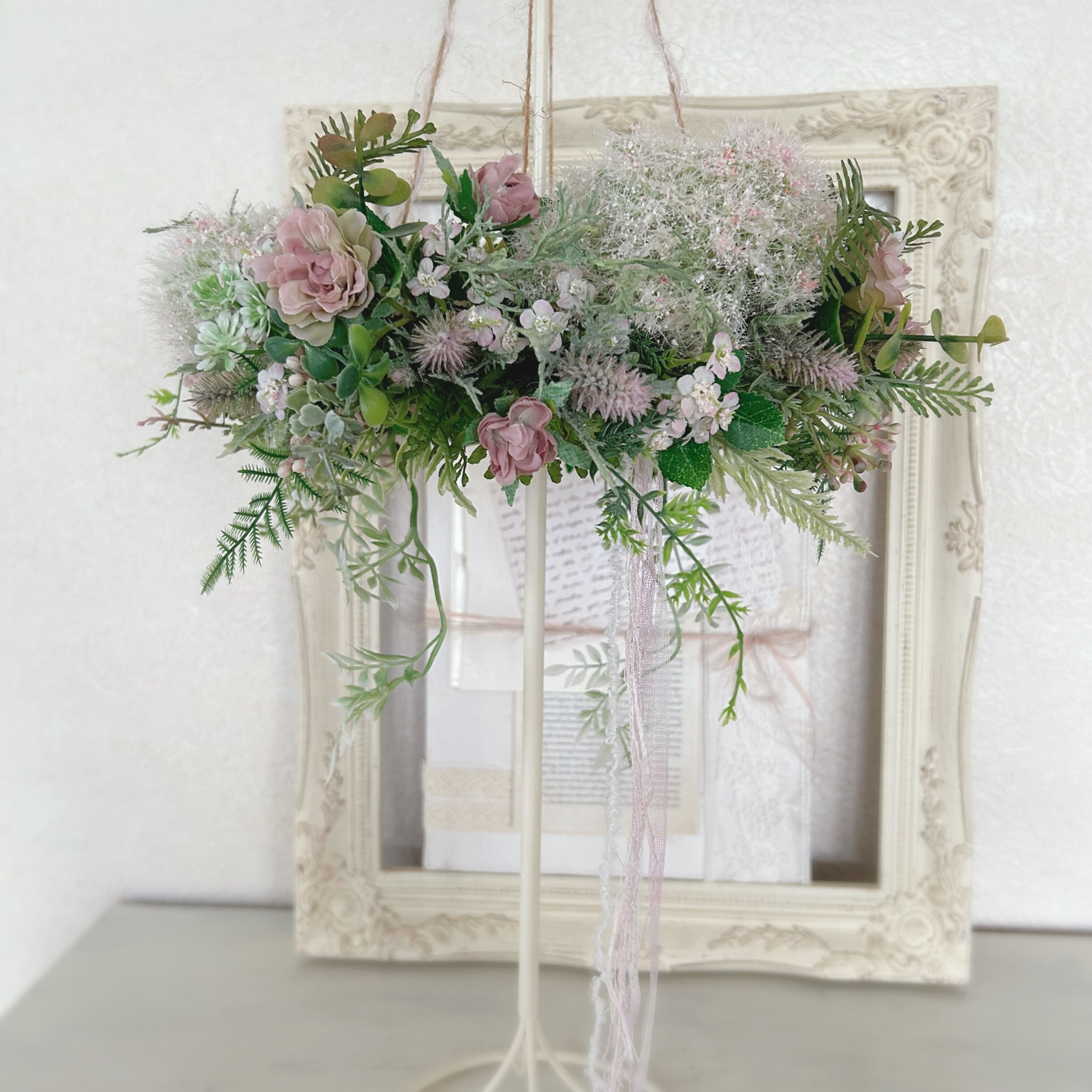 《使用花材》アーティフィシャルフラワー:スモークツリー、ユーカリ、バラ、スパニッシュモス、エリンジウム、ベビーブレス、ティーリーフ、グリーンネックレス、シダ、グリーン類