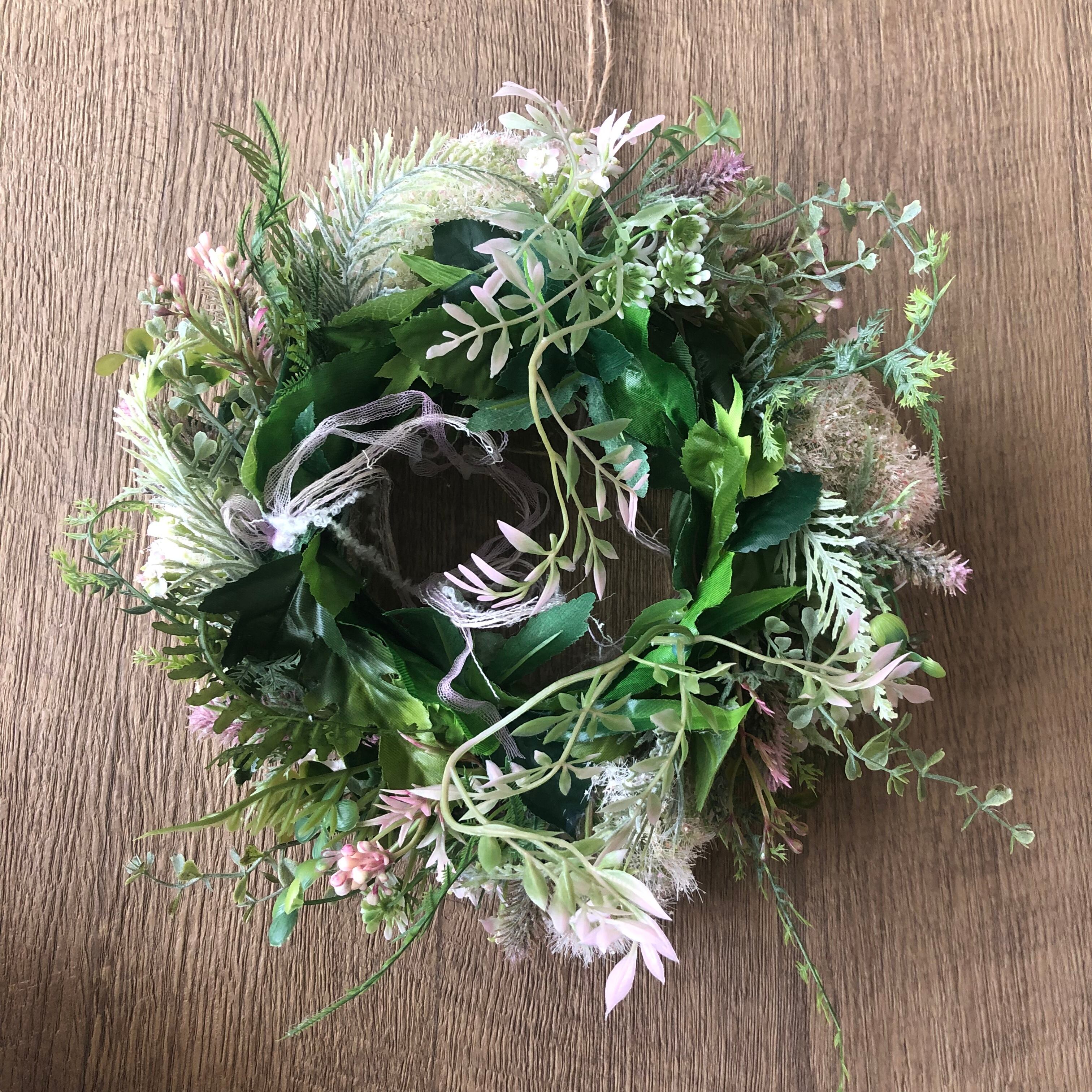 ピンクスモークツリーとミニバラのフライングリース/ナチュラルリース/アーティフィシャルグリーン/アーティフィシャルフラワー/フライングリース/リース/スモークツリー リース/ウェディングパーティ 飾り/ホームパーティ 飾り/新築祝い/結婚祝い/誕生日ギフト/母の日/母の日ギフト/