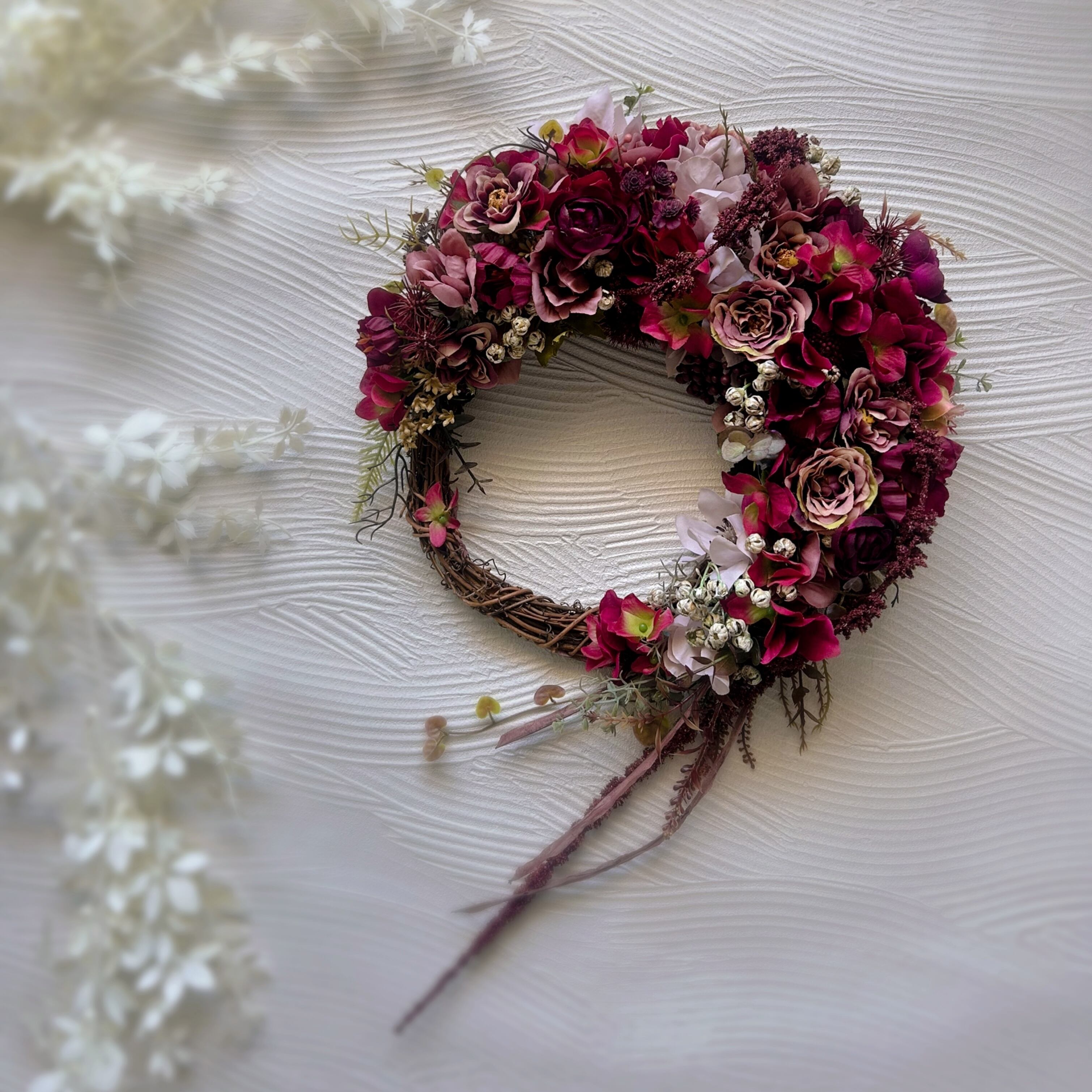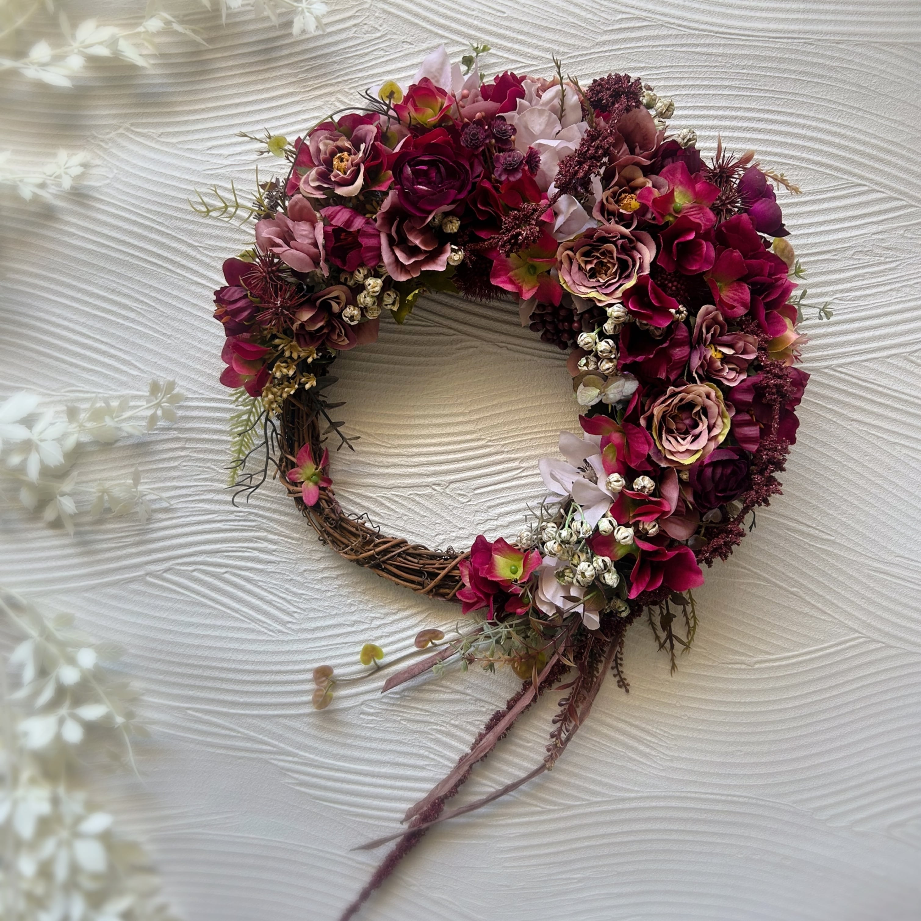 ワインカラーハーフリース/ナチュラルリース/アーティフィシャルフラワー/造花リース/玄関リース/秋色リース/シックカラー/大人リース/誕生日ギフト/結婚祝い/新築祝い/開店祝い/引越し祝い/プレゼント/母の日