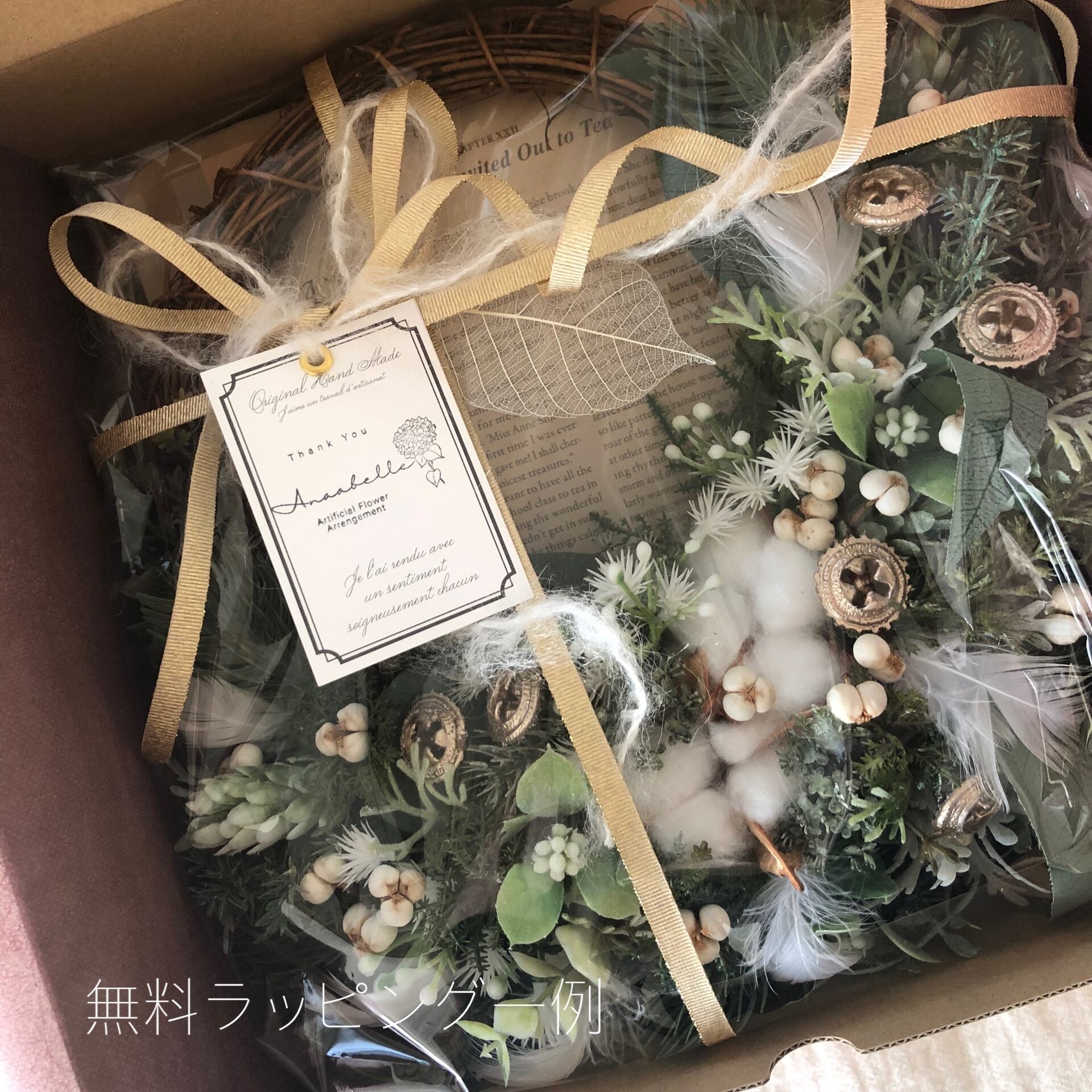 《使用花材》アーティフィシャルフラワー:パイン、ユーカリ、シダ、モス、モミ、グリーン類、ベビーブレス、クレマチスシード、羽根、木の実など
