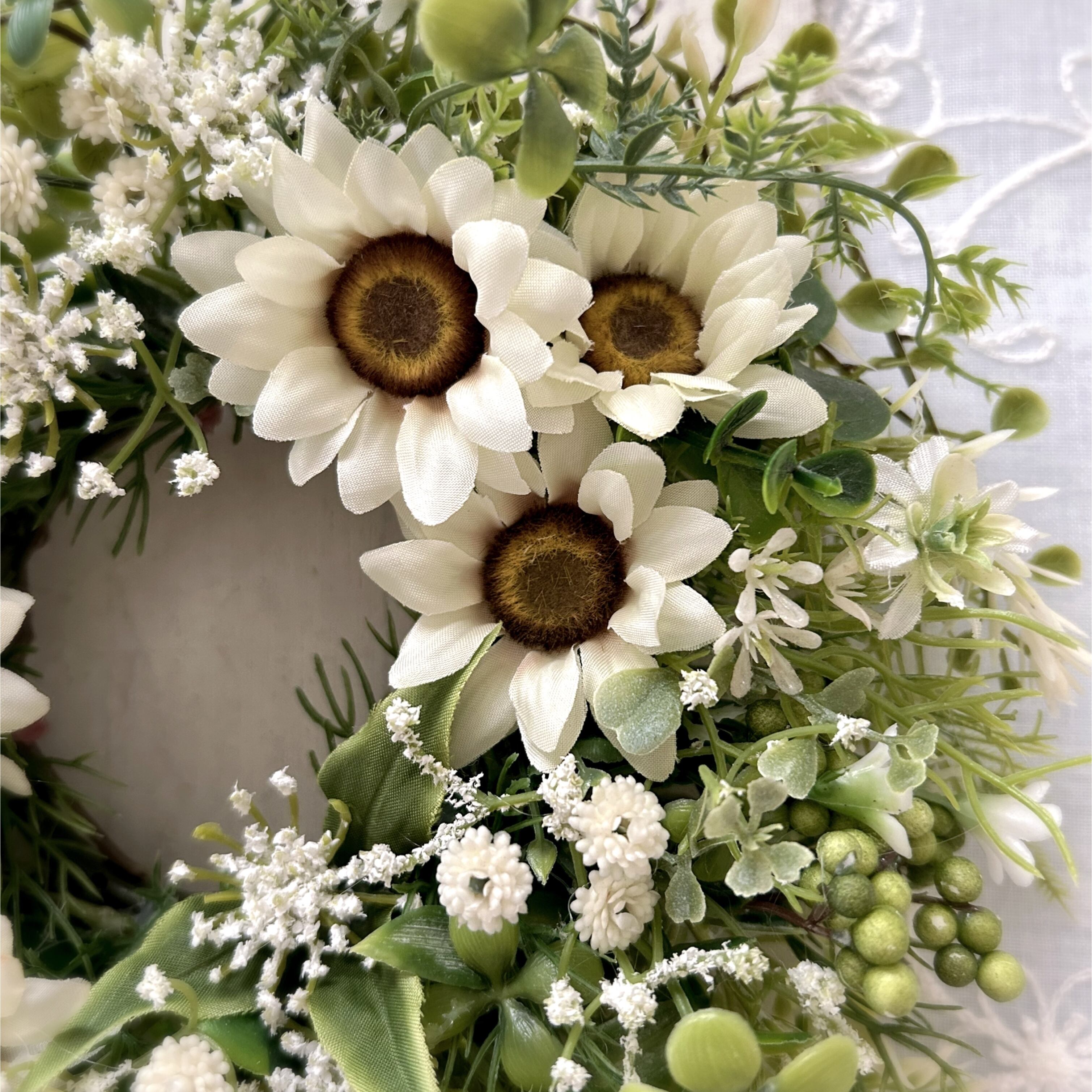 白い向日葵とグリーンのナチュラルリース/ナチュラルリース/ひまわりリース/造花リース/アーティフィシャルフラワーリース/グリーンリース/ドアリース/玄関リース/サマーリース/新築祝い/誕生日ギフト/結婚祝い/お祝いギフト