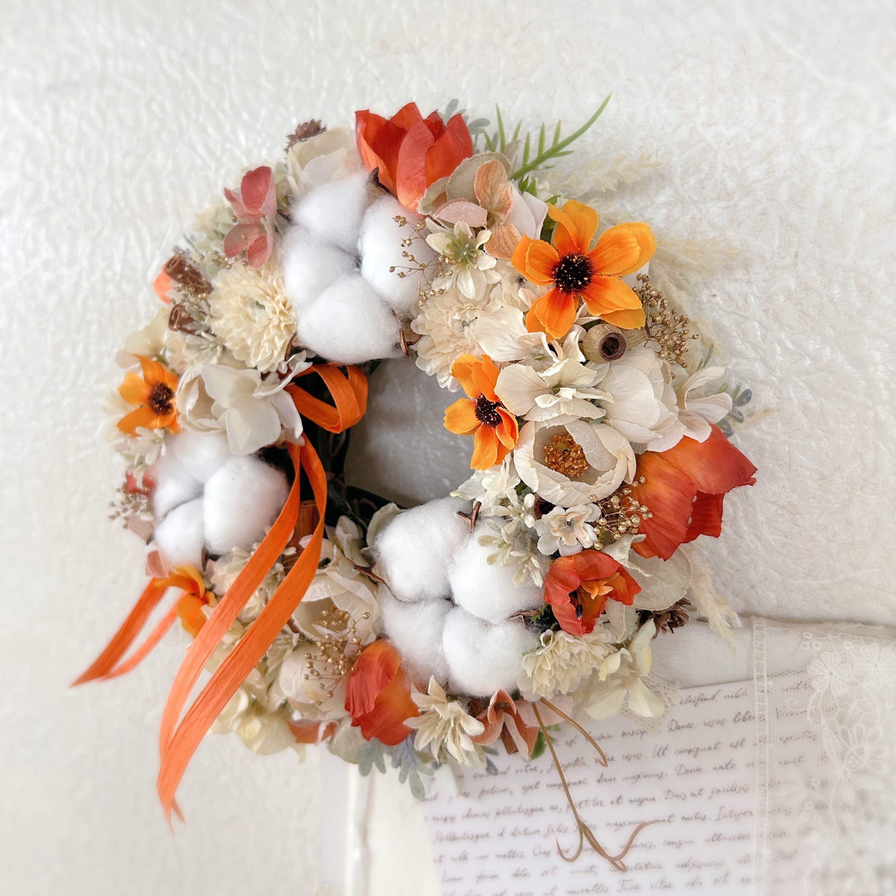 コットンとオレンジコスモスの秋色キャンドルリース/フラワーギフト/アーティフィシャルフラワーギフト/造花リース/白いリース/秋のリース/リース 秋/キャンドルリース/お祝いギフト/新築インテリア/新築祝いギフト/お花の贈り物/結婚祝いプレゼント/ナチュラルリース/リース おしゃれ