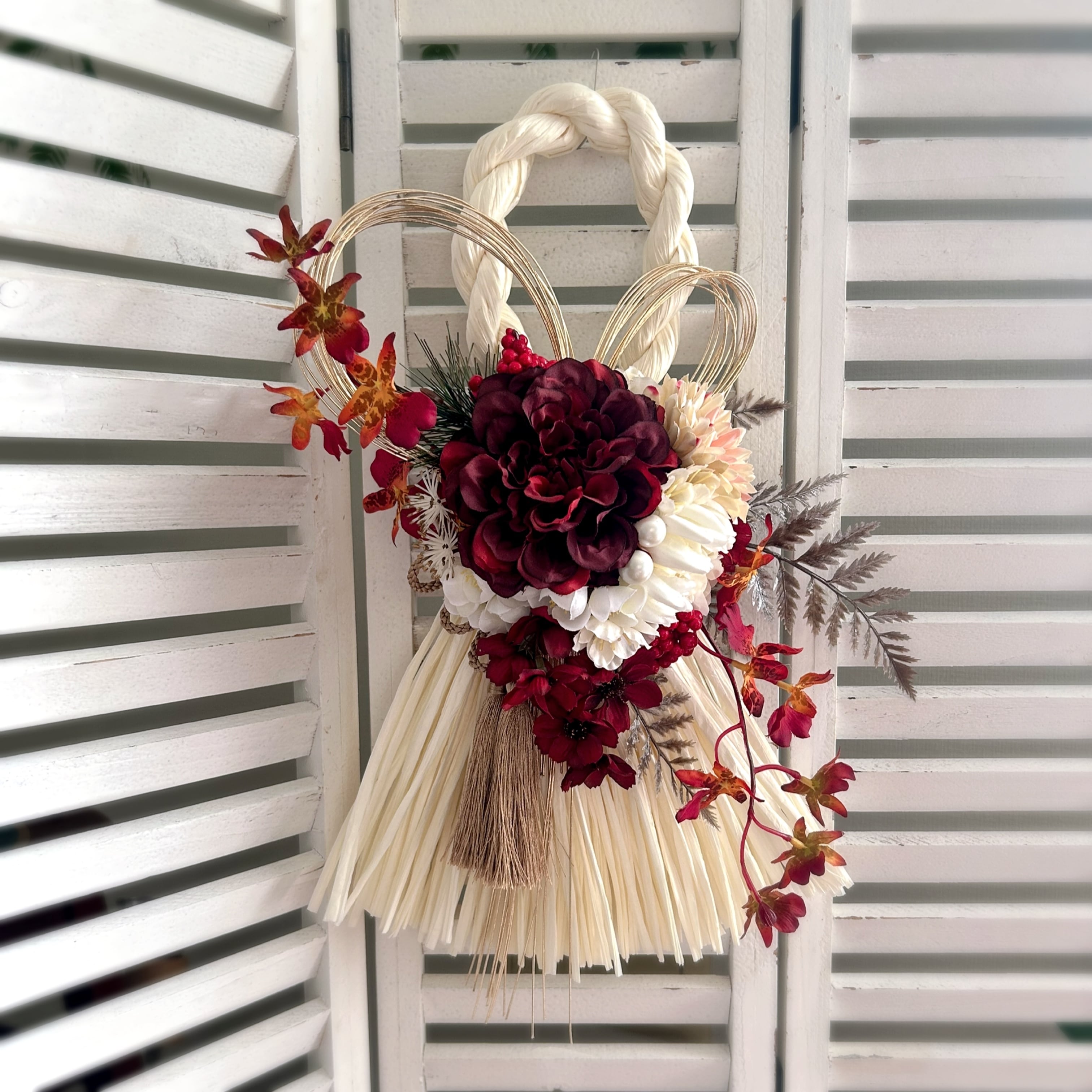 白い紙長しめ縄に真紅のダリア、菊、梅を