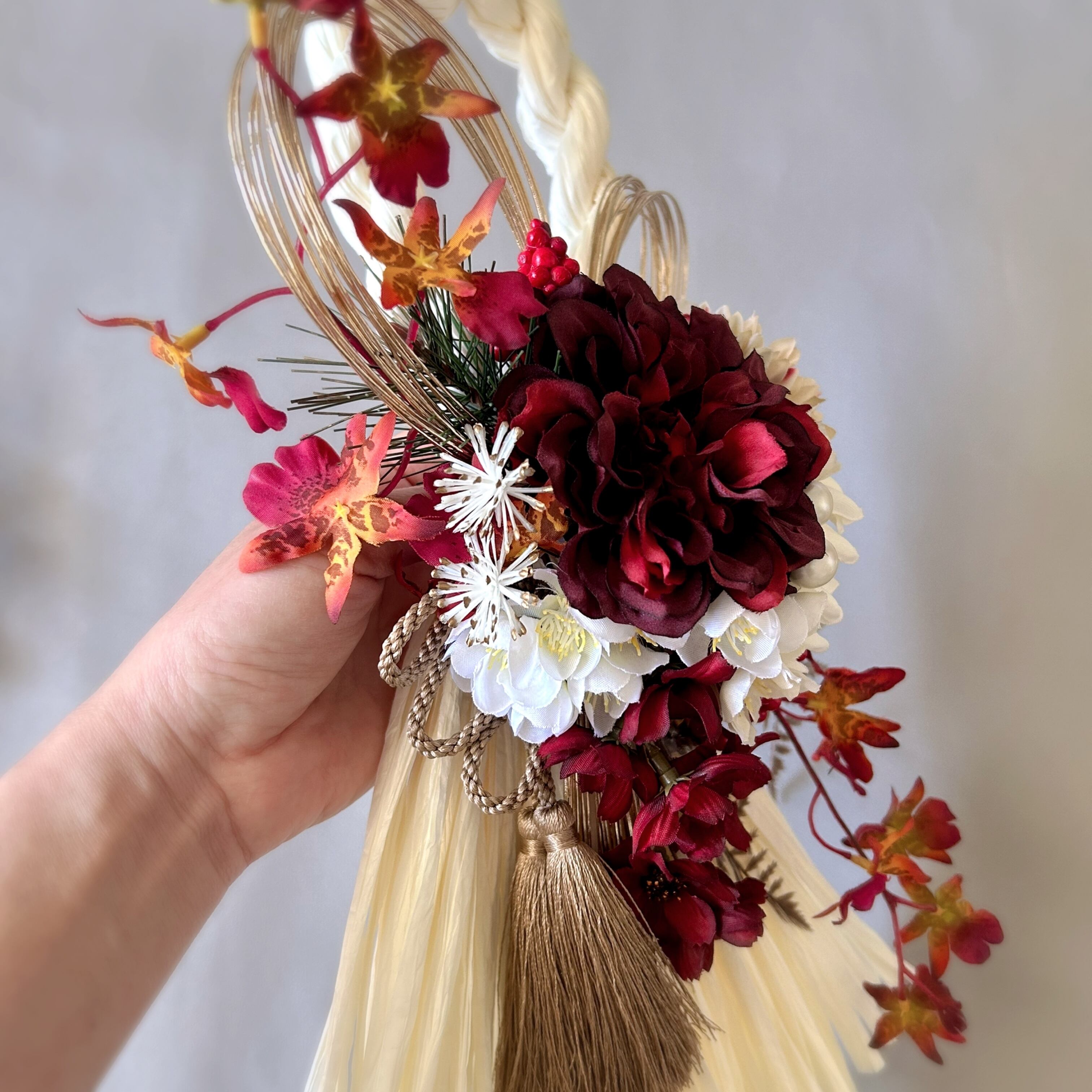 《使用花材》アーティフィシャルフラワー:菊、ダリア、梅、コスモス、シャイニーリーフ ドライフラワー:アスパラ、その他:紙しめ縄、水引、タッセル
