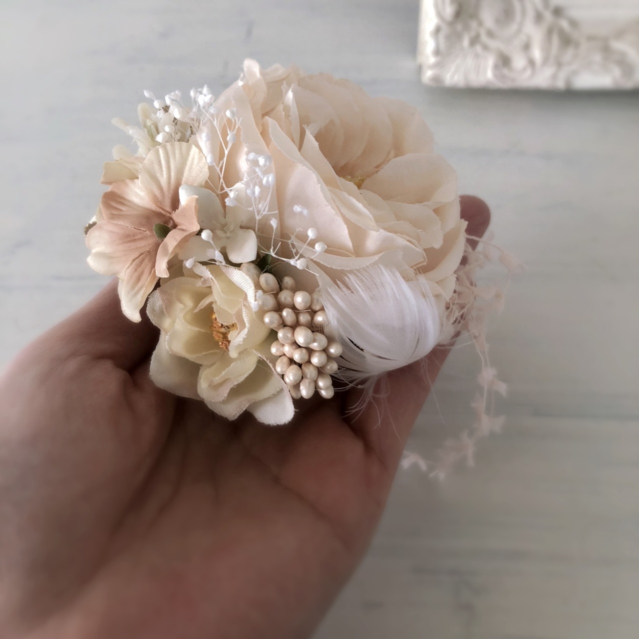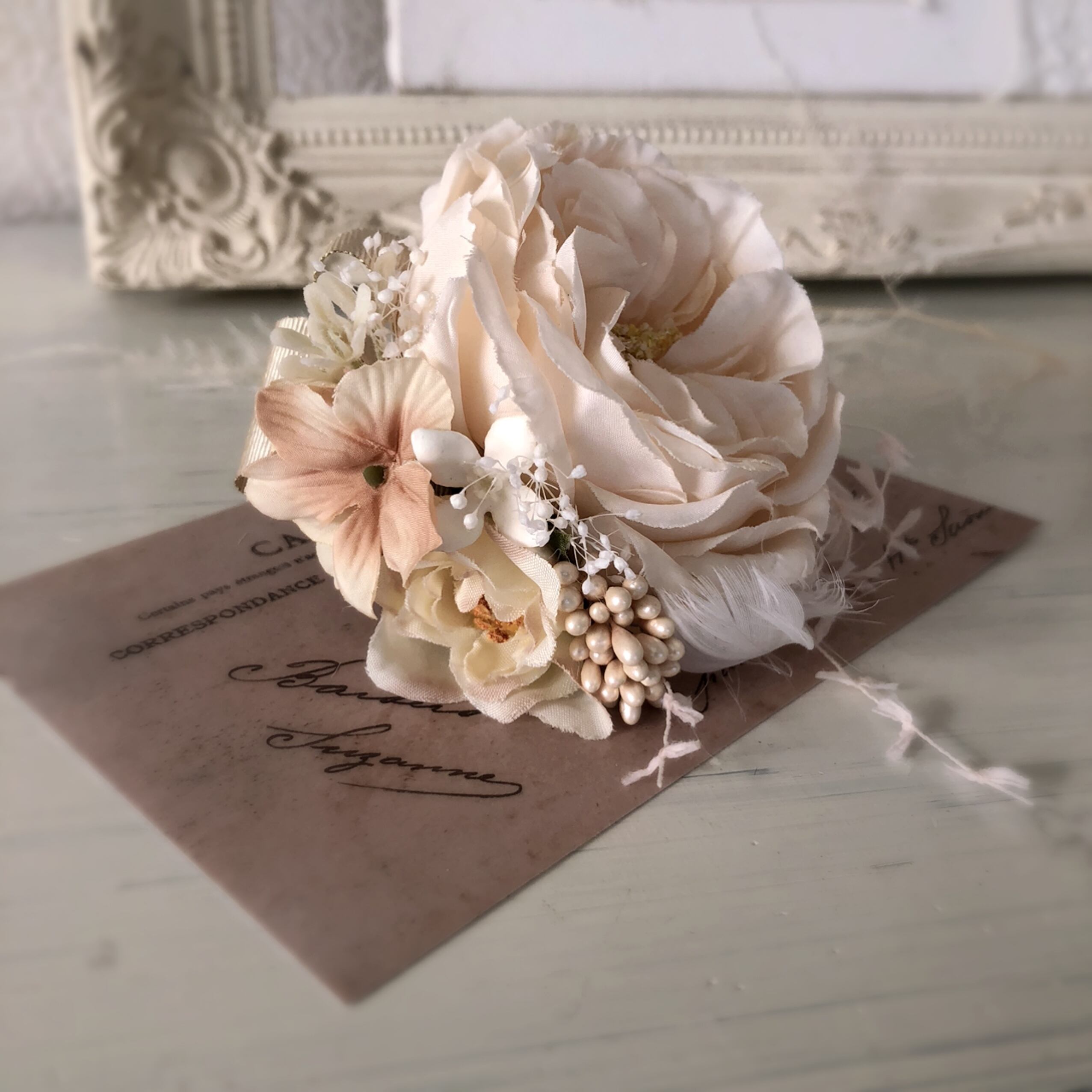 挟むことも出来る2wayタイプのコサージュ台を使っているので入学、卒業、結婚式のコサージュとしてだけでなくバックや帽子に付けたり、髪飾りとしても使っていただけます。