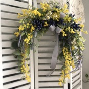 《使用花材》アーティフィシャルフラワー:ミモザ、ラベンダー、ブルーベリー、ローズマリー、マトリカリア、アニュサム、リボン