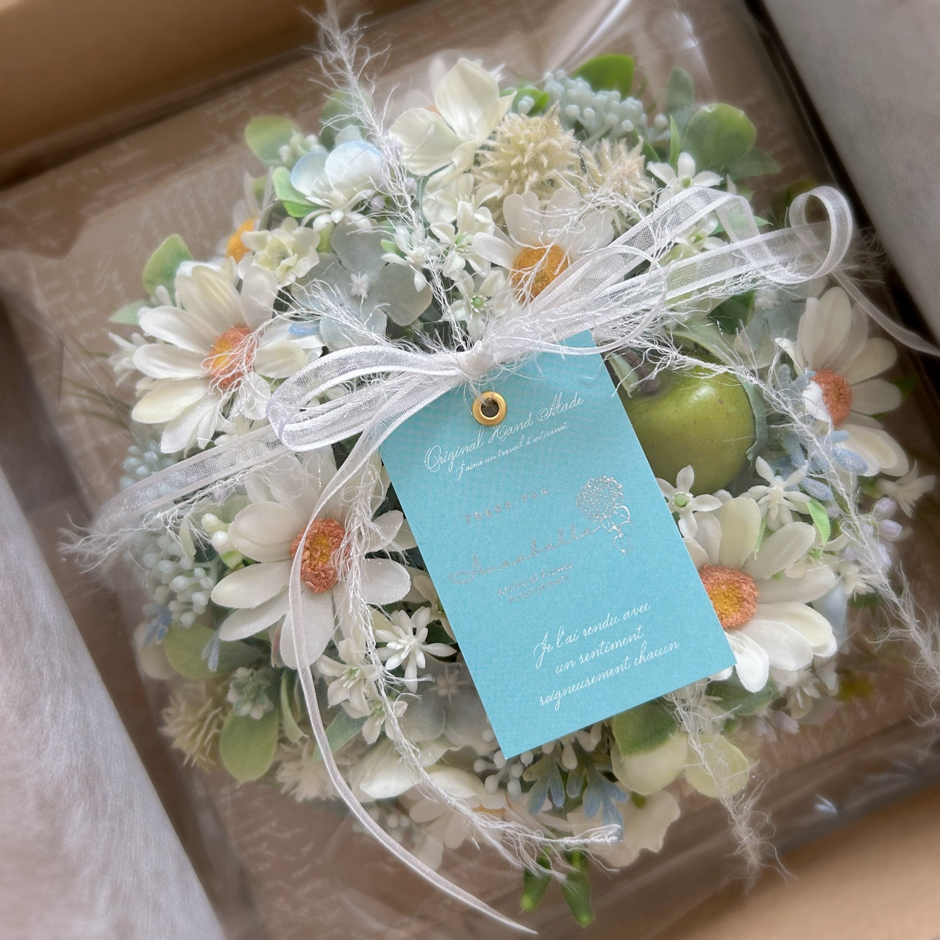 きちんと制作しておりますが、配送時の振動や扱い方によってはお花の接着部分から外れる場合があります。