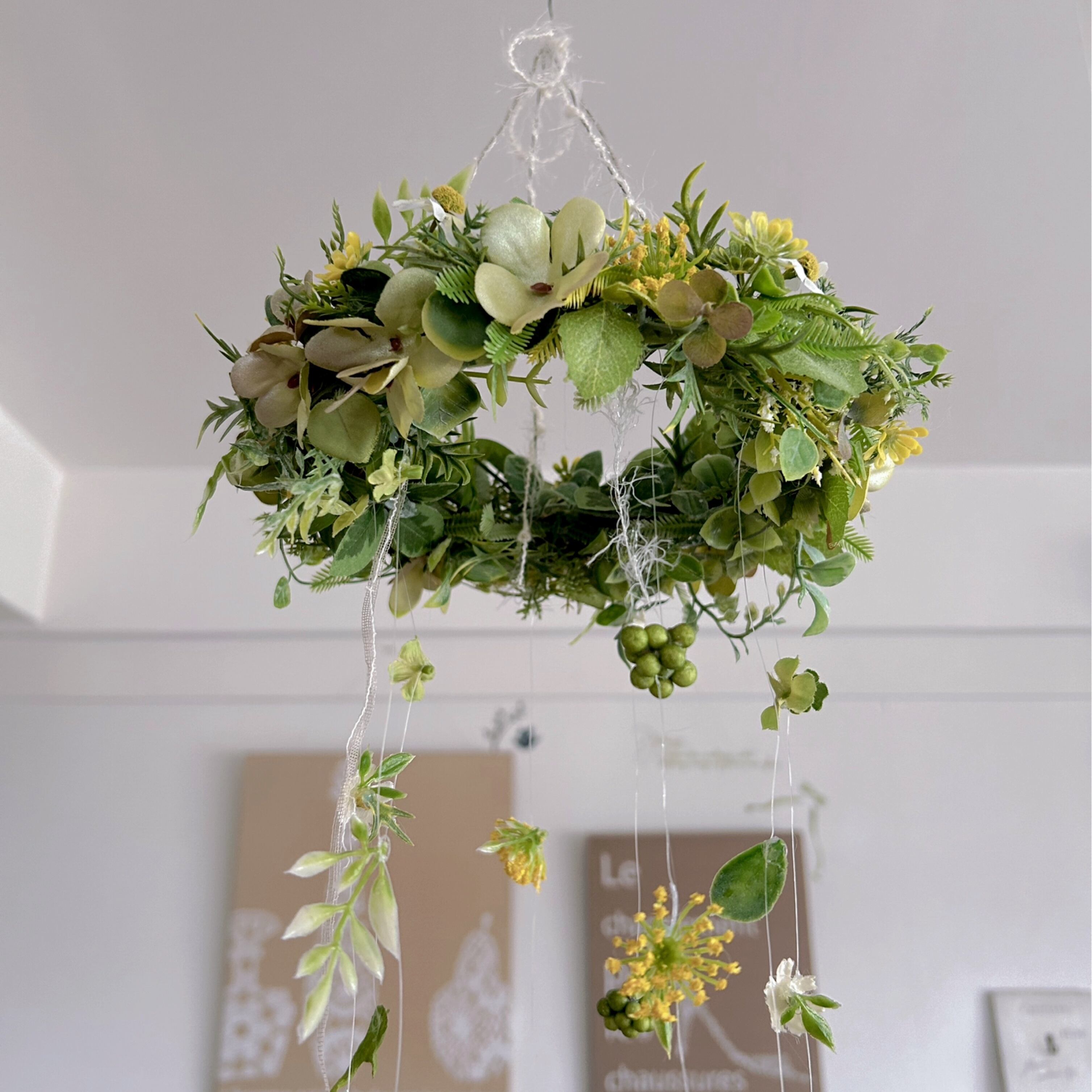 繊細なグリーンで作られたモビール風の