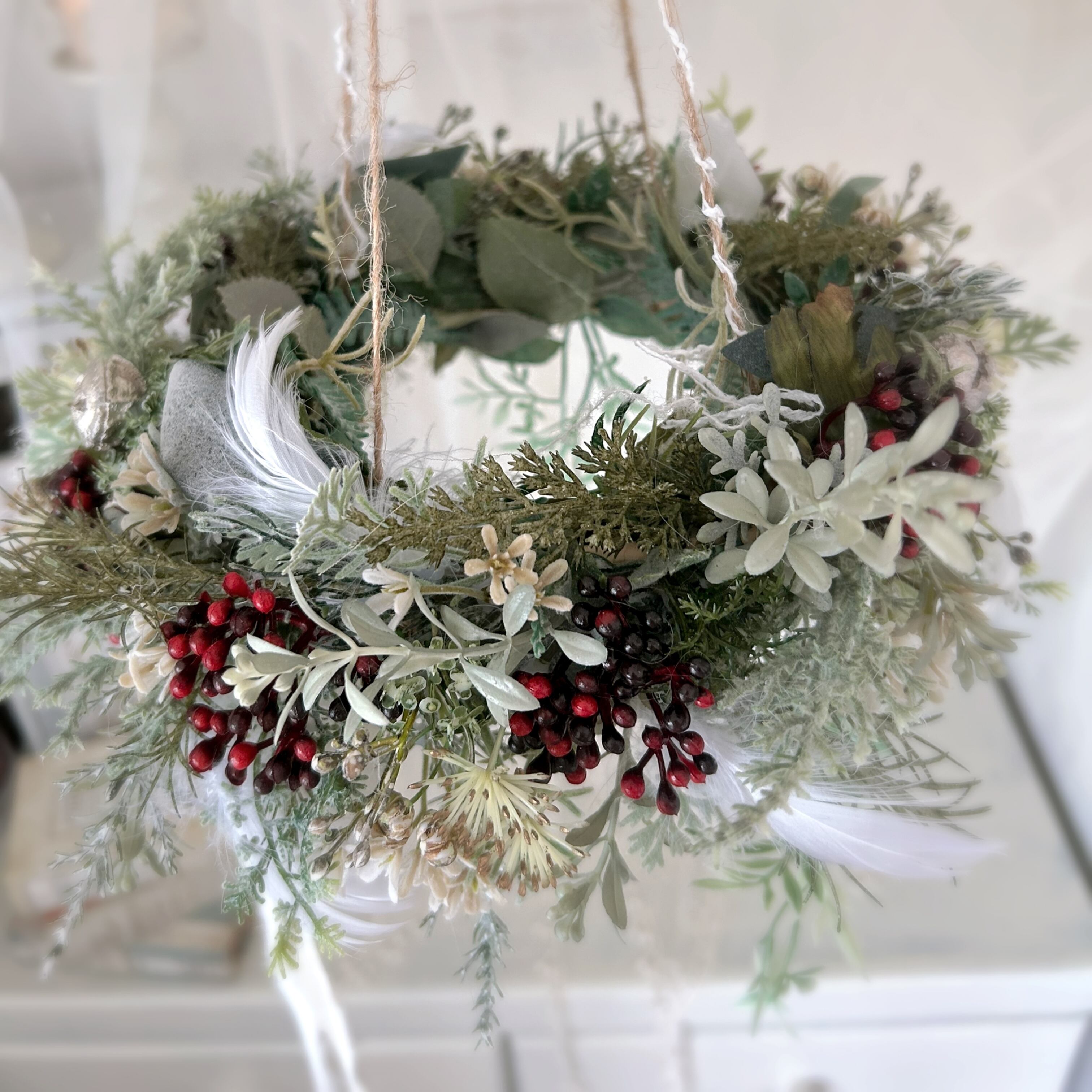 《使用花材》アーティフィシャルフラワー:モミ、ヒバ、ユーカリ、ベリー、ベビーブレス、グリーン類 その他:木の実、羽根、リボン