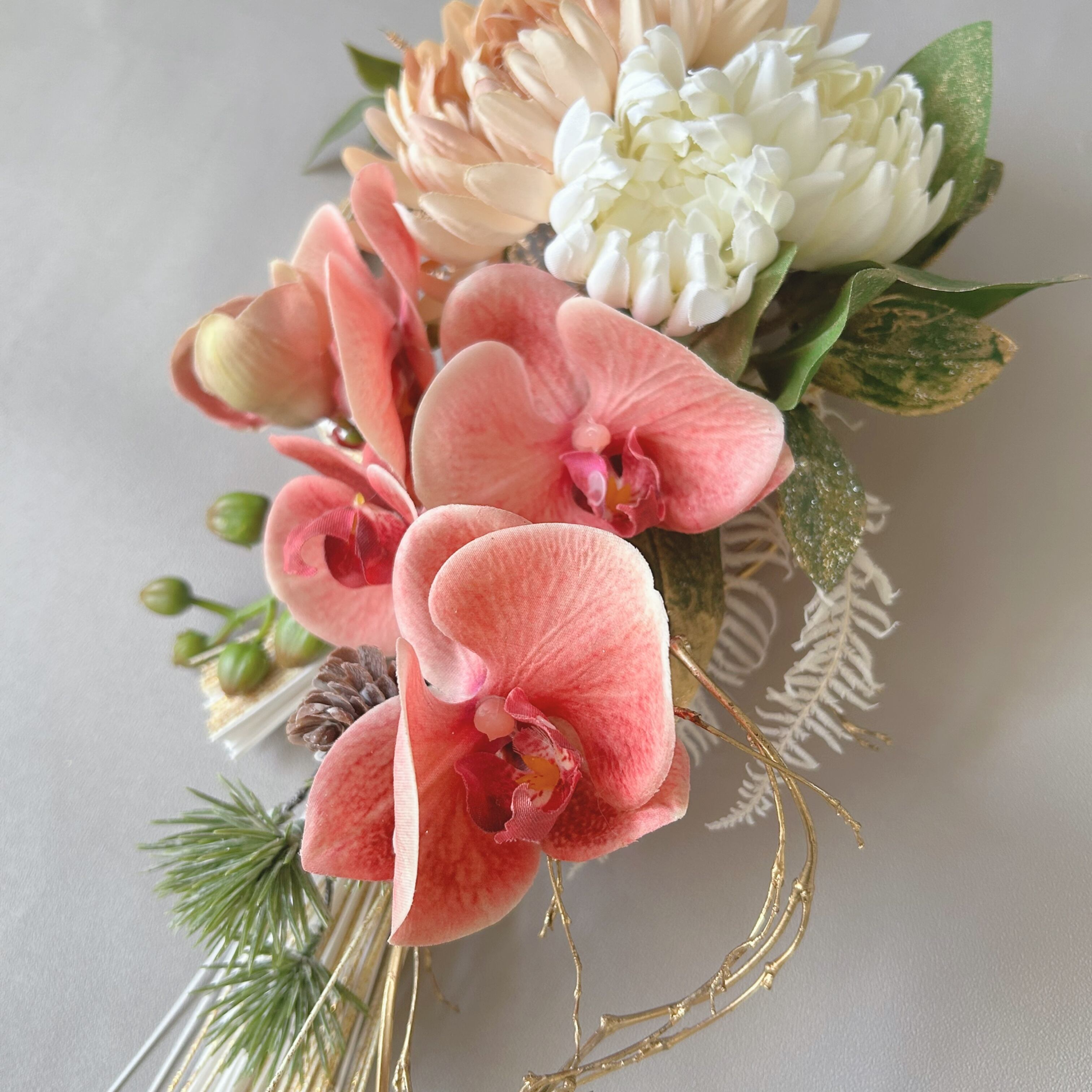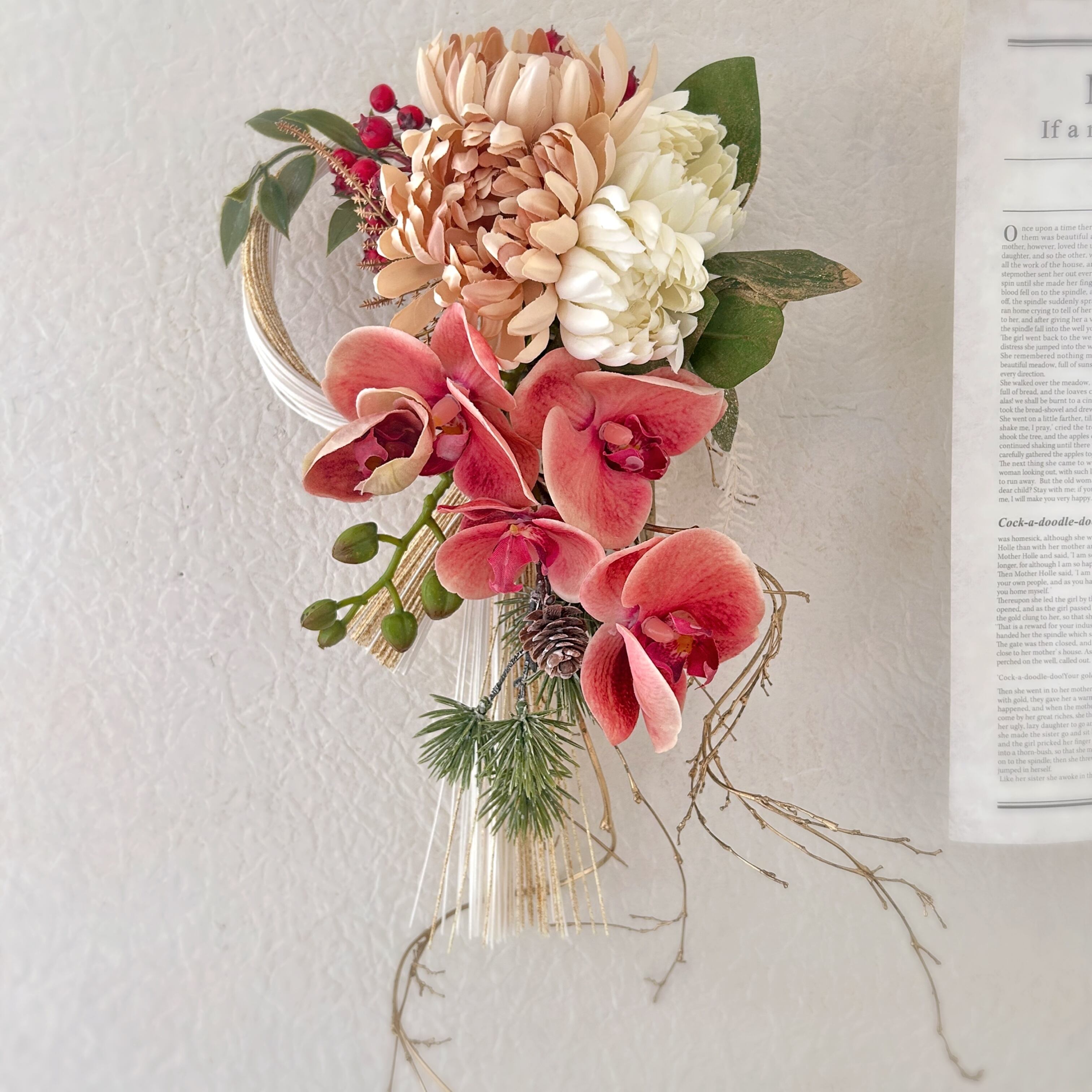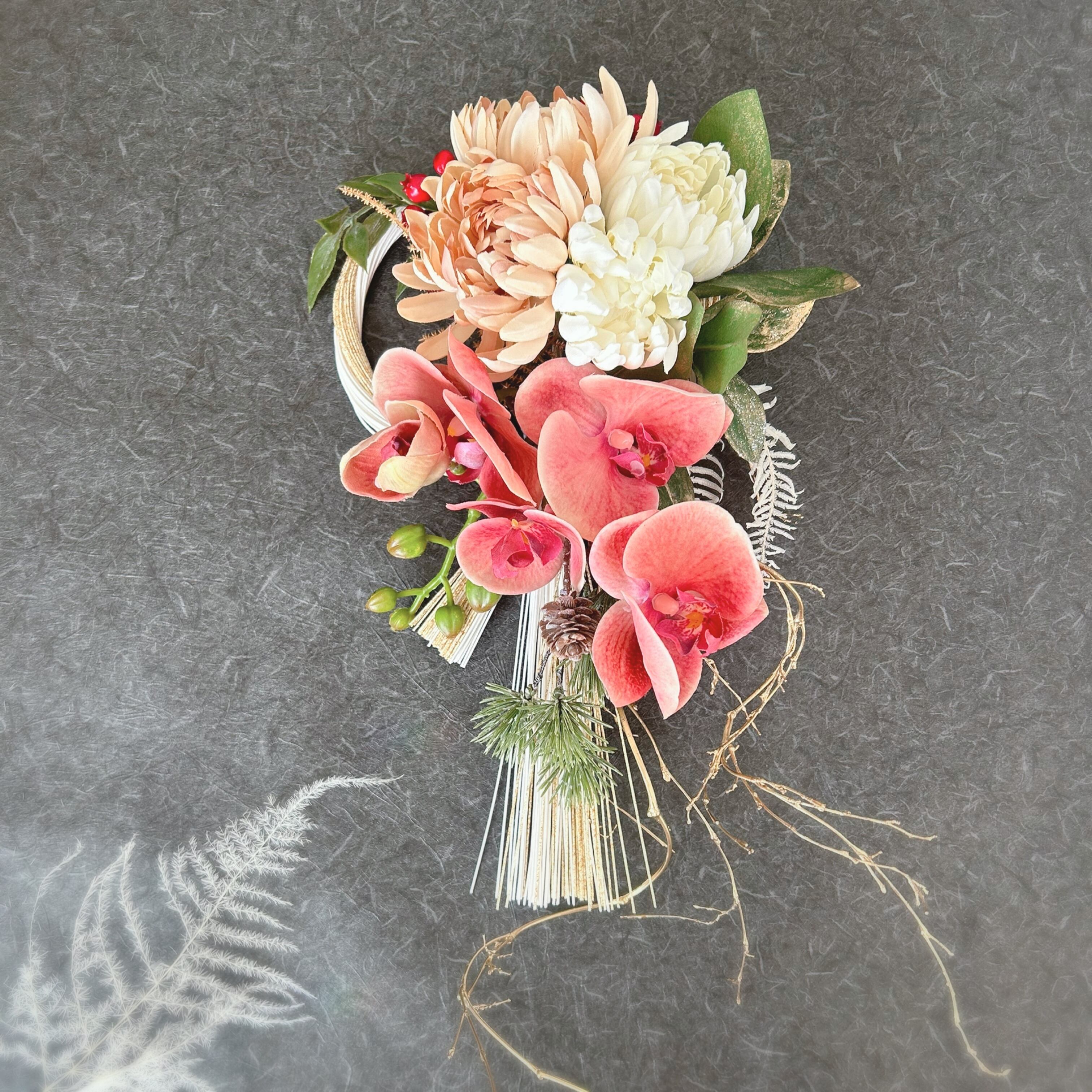 菊・胡蝶蘭・松のニュアンスカラーしめ飾り/しめ縄飾り/おしゃれしめ縄/モダンしめ飾り/和風モダン/お正月飾り/華やかしめ飾り/開運しめ飾り/造花しめ飾り