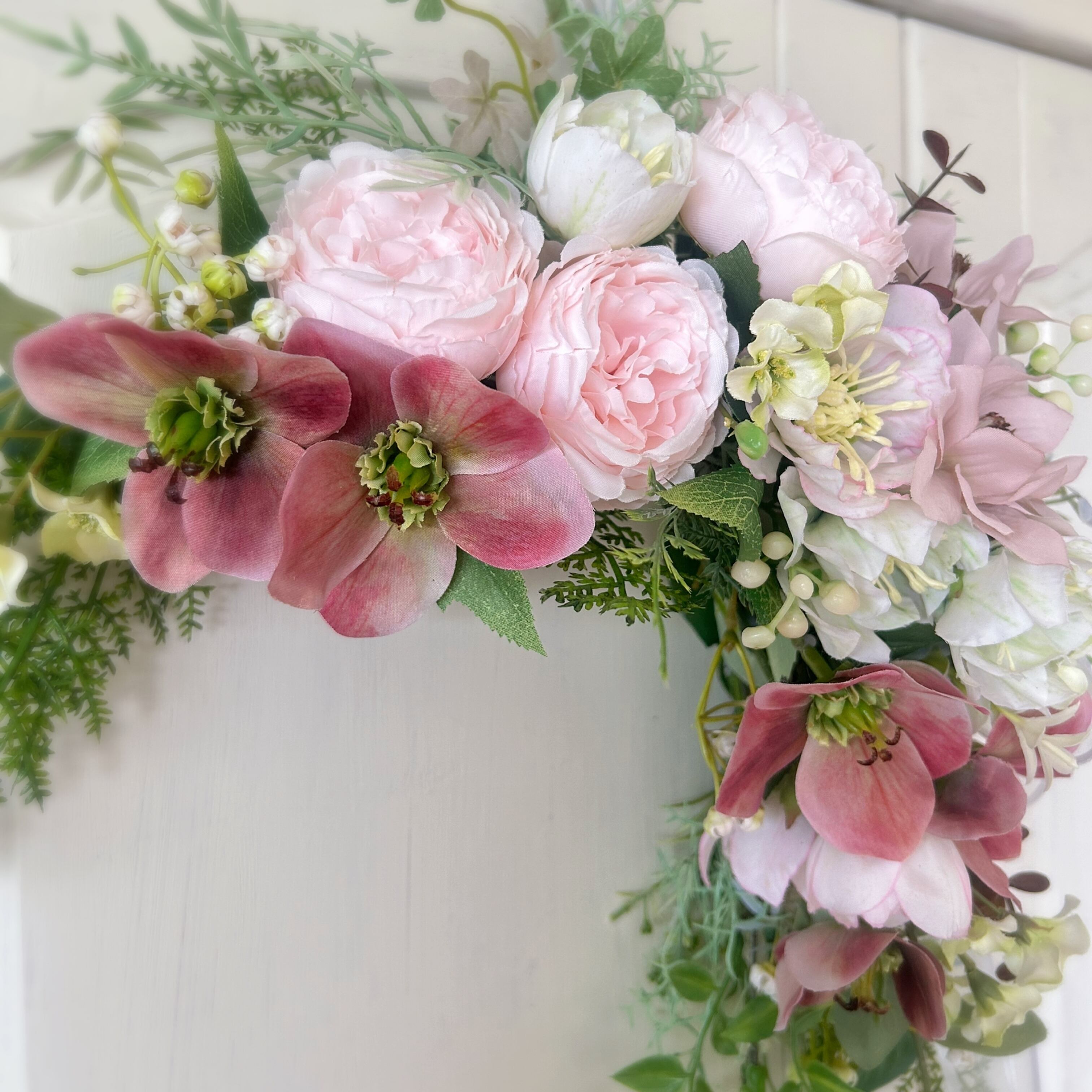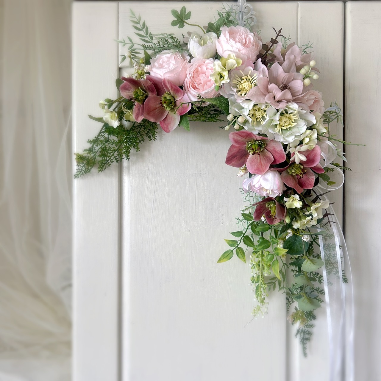ピンクローズとクリスマスローズのクレセントリース/三日月型リース/造花リース/フラワーインテリア/壁掛けインテリア/フラワーギフト/母の日ギフト/新築祝い/結婚祝い/ウェディングアイテム
