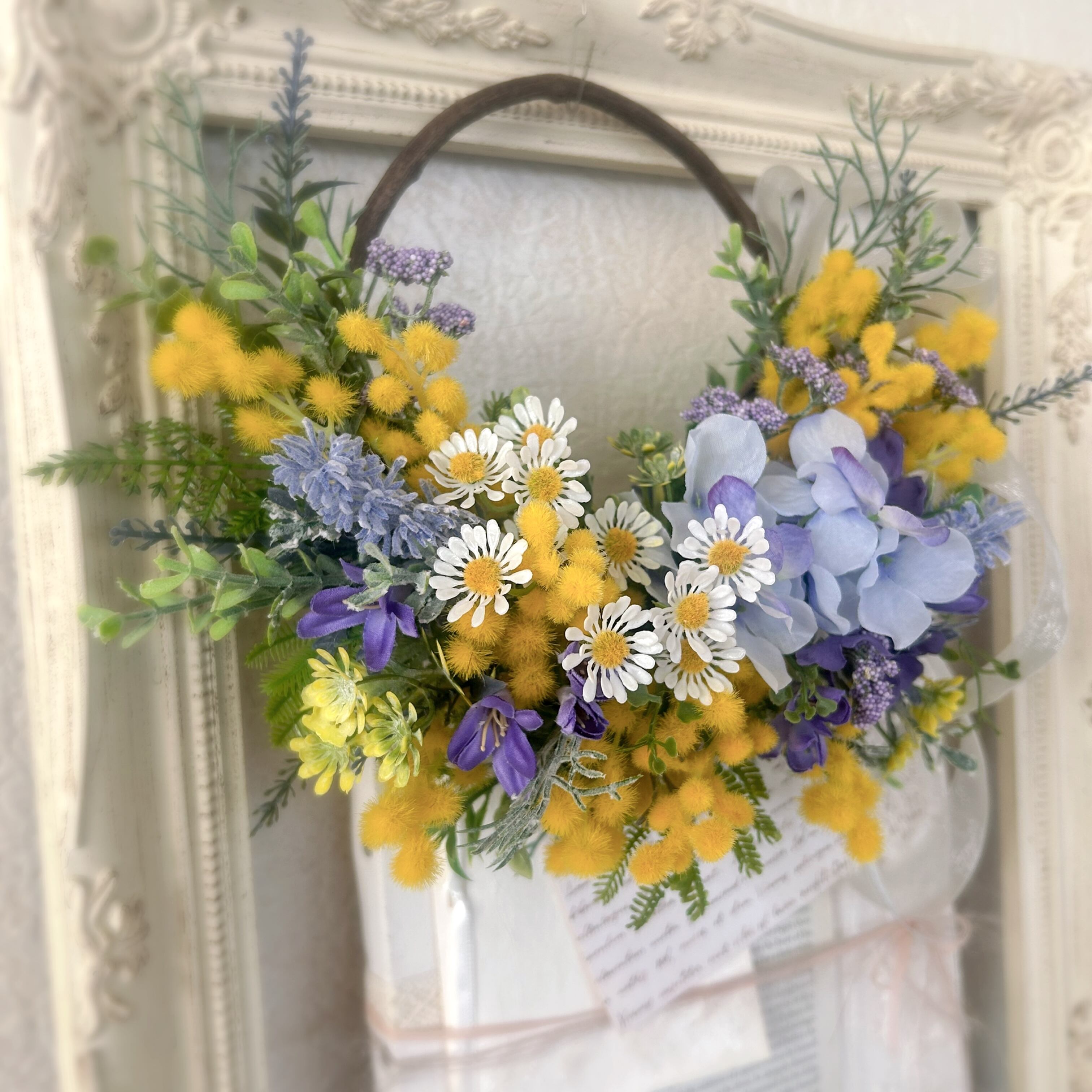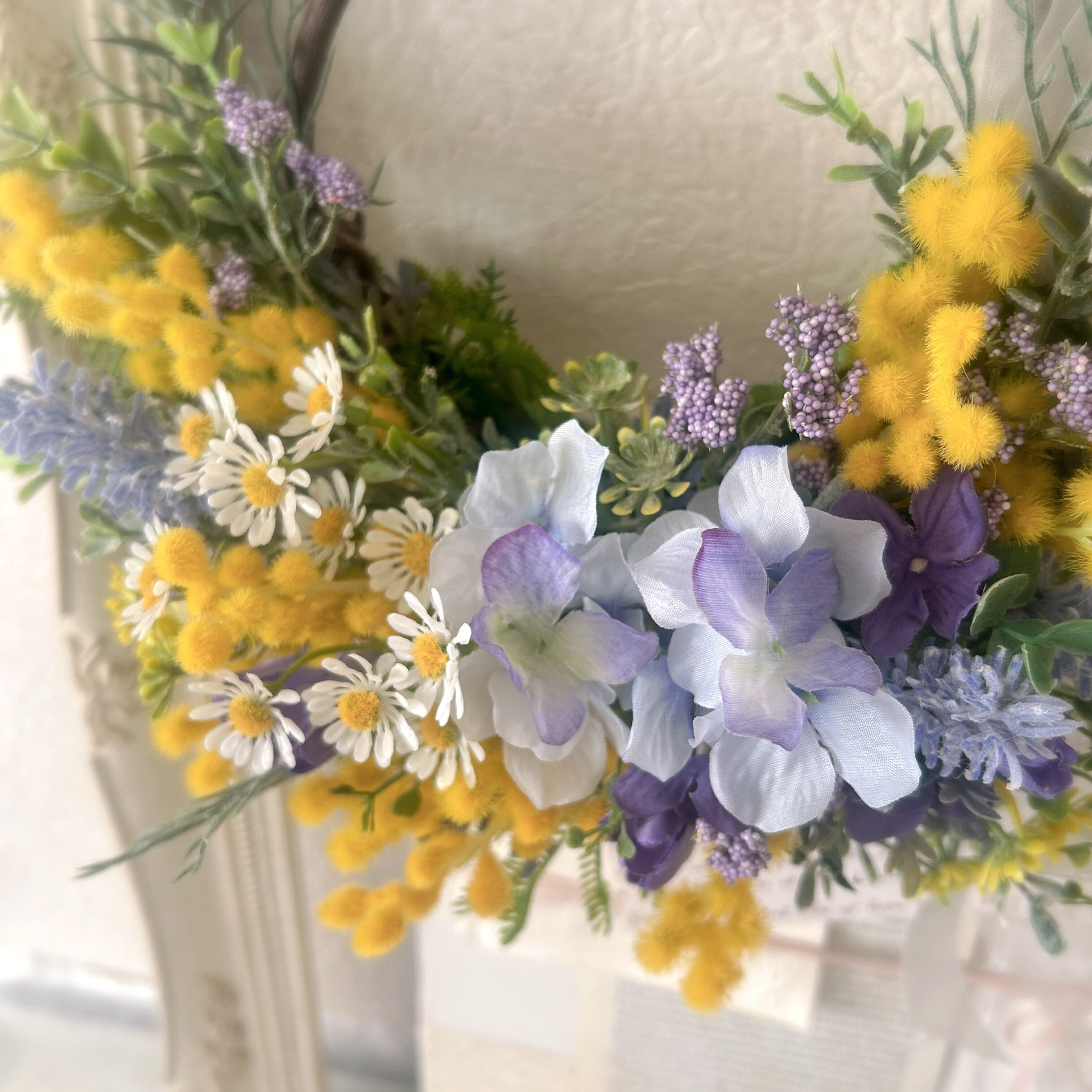 ミモザ・カモミール・ラベンダーの春色ハーフリース/春リース/フラワーインテリア/フラワーギフト/ドアリース/ハーフリース/造花リース/新築祝い/母の日ギフト/誕生日プレゼント/結婚祝い